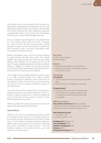 EXECUTIVE SUMMARY ABOUT THE EIC THE KING S AWARDS 2023 OVERVIEW OF COMPANIES OVERVIEW OF STRATEGIES COMPARISON TABLE DEEP DIVE S Netzero Jeopardy 24 Oil & Gas = recession-proof 26 Shock news! New markets are too hard 28 Everybody is talking about people. But why? 30 Oil & Gas for profit and renewables for business value 32 Beyond the hope and hype 34 Good times ahead. We hope 36 Leadership Lessons for a booming market 38 STRATEGIES AT A GLANCE SUCCESS STORIES CASE STUDIES 4 10 11 14 18 22 40 42 44 TABLE OF CONTENTS