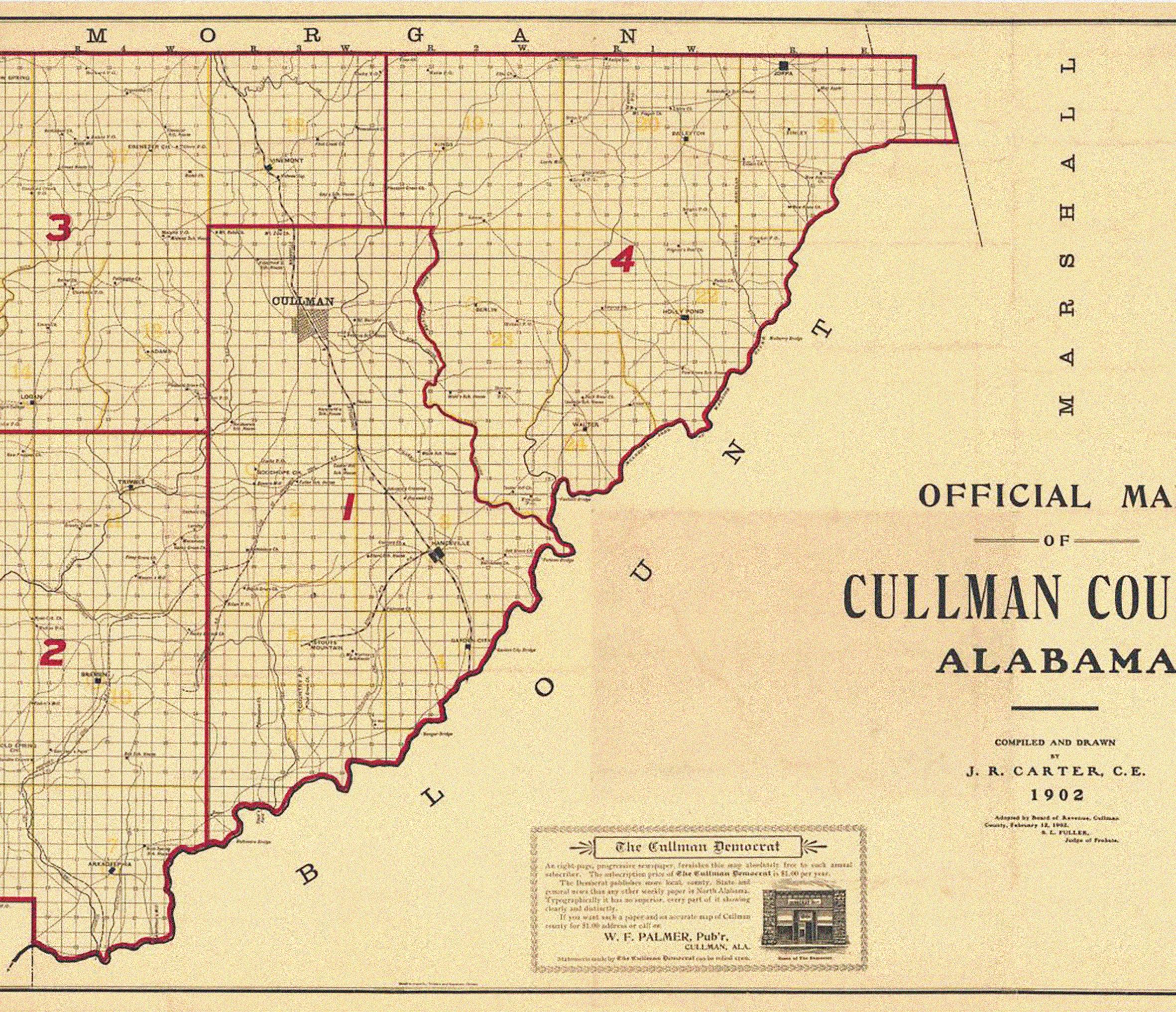 A map of Cullman County from the year 1902 provided by the Alabama Department of Archives and History shows the present day borders of the county following the annexation of Hanceville on its southern border. Cullman County is the second youngest county in the state of Alabama.