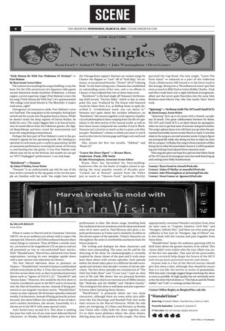 appropriately continues Wanda’s storyline from what we have seen in “Captain America: Civil War” and “Avengers: Infinity War,” and there are even some great callbacks to her start in “Avengers: Age of Ultron” too. It also deals with her trauma and past tragedies from these films. “WandaVision” keeps the audience guessing with its little hints about the greater mystery to be solved. This viewer didn’t even realize who the true villain was until the last two episodes. That and all the post-credits scenes certainly help shape the future of the MCU and set-up more potential mov ies and shows. Anyone who is a fan of the Marvel movies should give this show a shot, although they should be aware that it is not like the movies in terms of presentation. With that said, I strongly suggest binge-watching this show as soon as possible. Its high quality has me extremely excited for the other Marvel shows — “The Falcon and the Winter Soldier” and “Loki” — coming out later this year. Contact Dillon Begley at dbegley@hcc-nd.edu