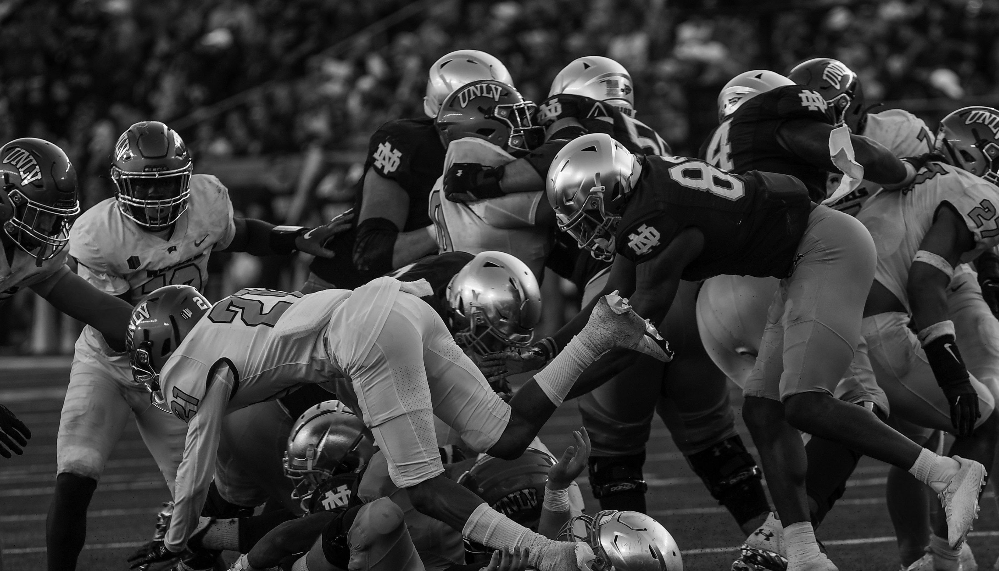The Irish football team battles with the UNLV Rebels near the goal-line in Notre Dame’s 44-21 win over the Rebels at Notre Dame Stadium on Oct. 22 at Notre Dame Stadium. The game was the first in a season-high five-game winning streak for the Irish, who finished 9-4 in Marcus Freeman’s first season as head coach despite a rocky 0-2 start to the season.