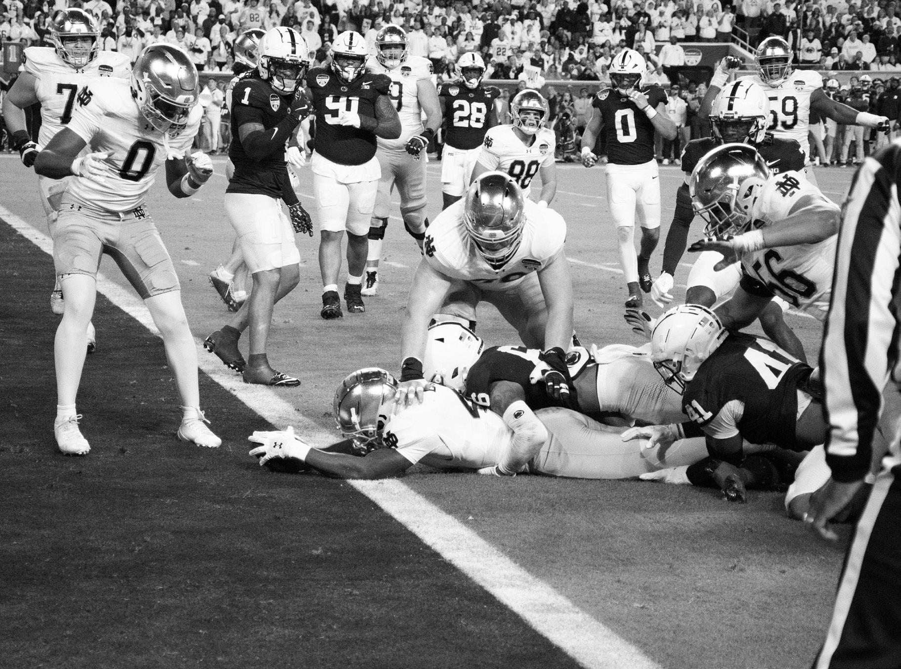 Sophomore running back Jeremiyah Love reaches the ball over the goal line during Notre Dame’s 27-24 defeat of Penn State in the Orange Bowl at Hard Rock Stadium in Miami Gardens, Florida, on Jan. 9, 2025.