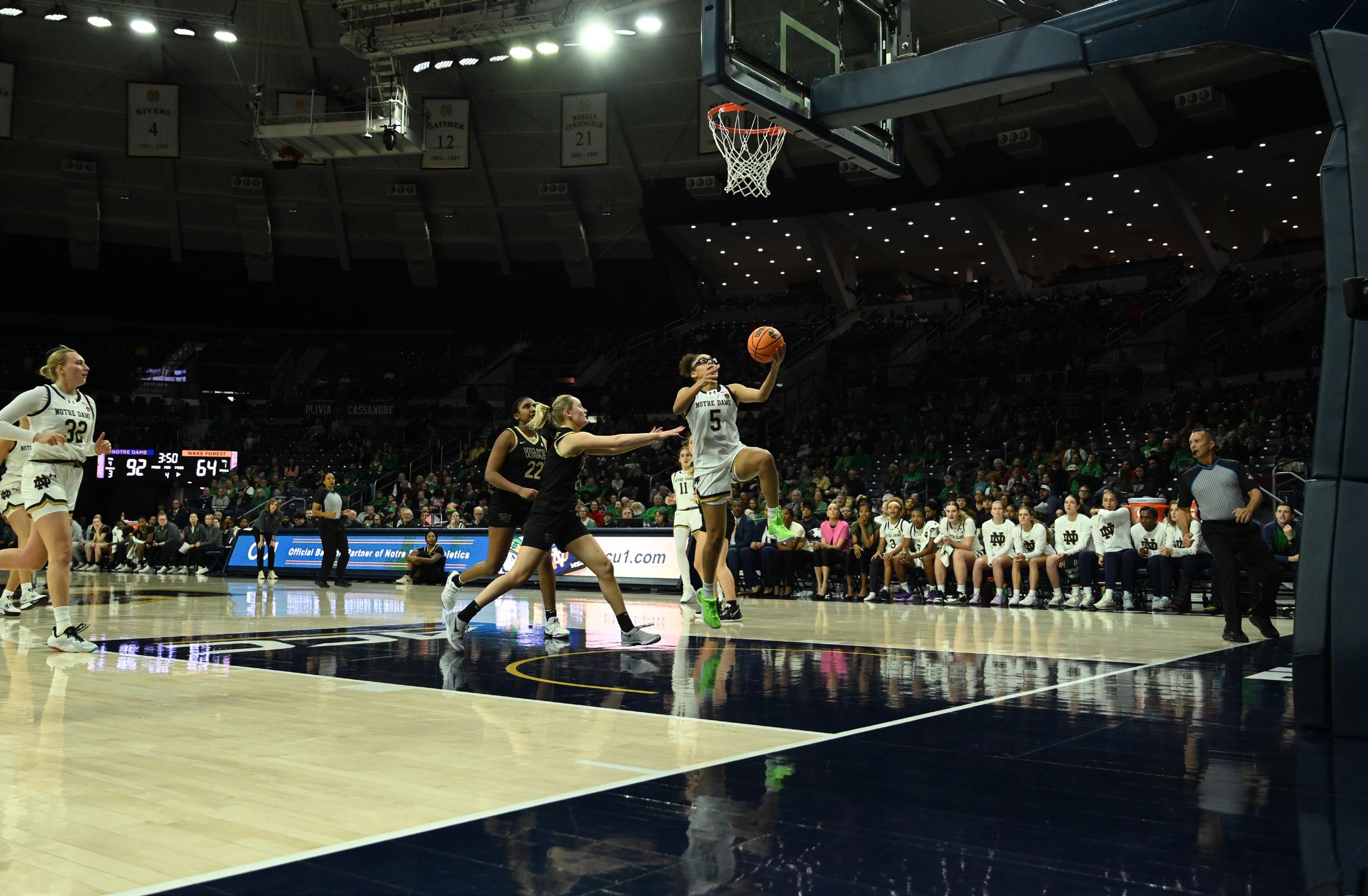 Graduate guard Olivia Miles leaps for a layup during Notre Dame’s 100-64 defeat of Wake Forest at Purcell Pavilion on Jan. 9, 2025. Miles and the Irish enter Thursday’s top-20 matchup against Georgia Tech having won nine consecutive games and with a perfect record in ACC play.