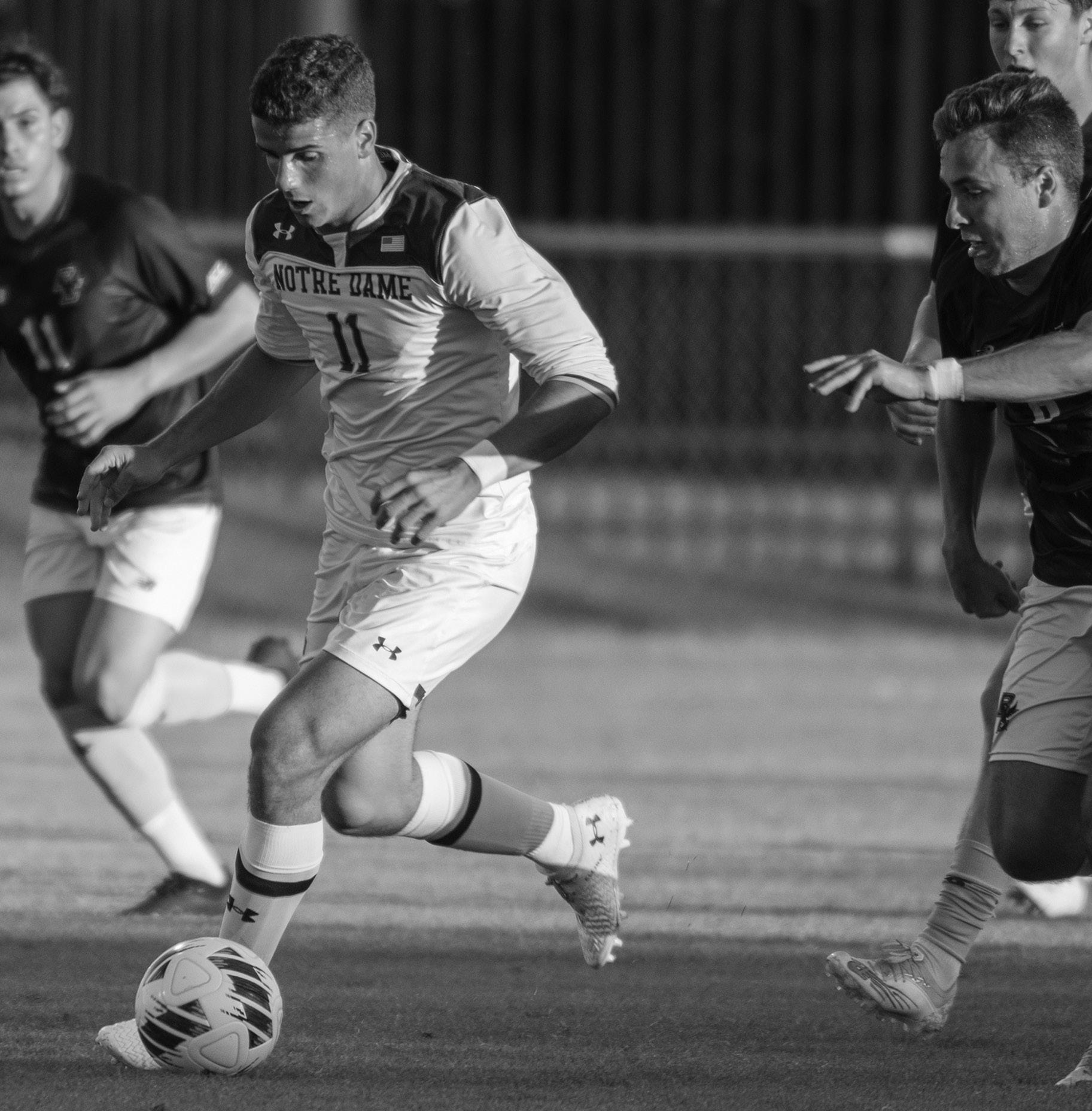 Irish junior forward Daniel Russo dribbles the ball in a game against Boston College on Sept. 30. Russo has scored two goals and had four assists so far this season. Notre Dame has a current record of 8-6-1.