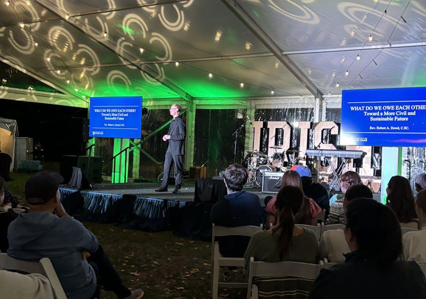 On Monday and Tuesday evenings on Library Lawn, the Notre Dame Ethics Initiative and the Notre Dame Institute for Ethics and the Common Good sponsored “Fr. TED Talks: Ideas from the Catholic Social Tradition That We Find Inspiring.” The two-day event was held as part of the 202425 Notre Dame Forum: What Do We Owe Each Other?