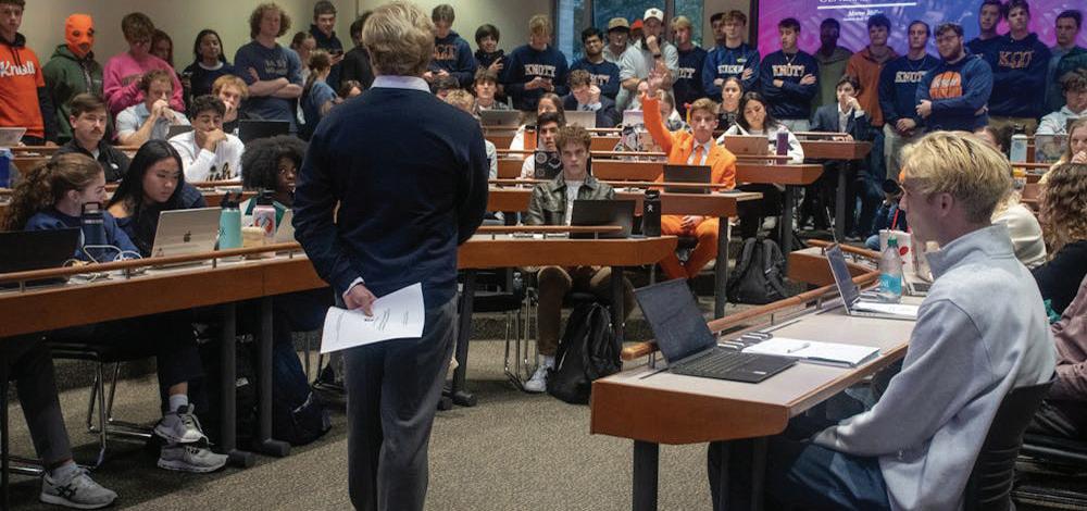 Knott Hall senator John Knott asks a question during the debate on the bill of his impeachment. The senate meeting was packed with Knott Hall residents and other students hoping to show their support.