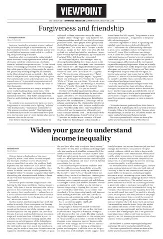 family because the income from one job just isn’t enough. Furthermore, the author’s own purported evidence, which was thin to begin with, falls apart upon closer examination: W hen reading the study in question, it becomes quite clear that while it argues that income inequality has not grown, it acknowledges the current existing income inequality is still problematic. So, what solutions would I offer? Again, I return to my opening statement: Listen to both sides of the stor y. Liberals and conser vatives have proposed different measures, including a higher minimum wage, increasing estate ta xes, fairer housing and education, campaign finance reform and lower income ta xes. The author’s own proposed solution is to focus on increasing economic grow th in order to increase the wealth of the poor and therefore raise the standard of living for ever yone. But without income equality, how will this wealth reach the poor? The wealth is already there, as she points out: One percent of the populations owns almost 36 percent of the countr y’s wealth. It is not going to just trick le down. I am not sure what needs to be done, but I am certain that something must be done. I urge the author and others like her to see the value of each human being as unconditional, and to think not of statistics but of real people. For if we ignore the lived experiences that result from income inequality, we risk dooming an entire section of our countr y to inescapable poverty. Michael Dinh is a senior majoring in biology and psychology. He can be reached at mdinh@nd.edu The views expressed in this column are those of the author and not necessarily those of The Observer.