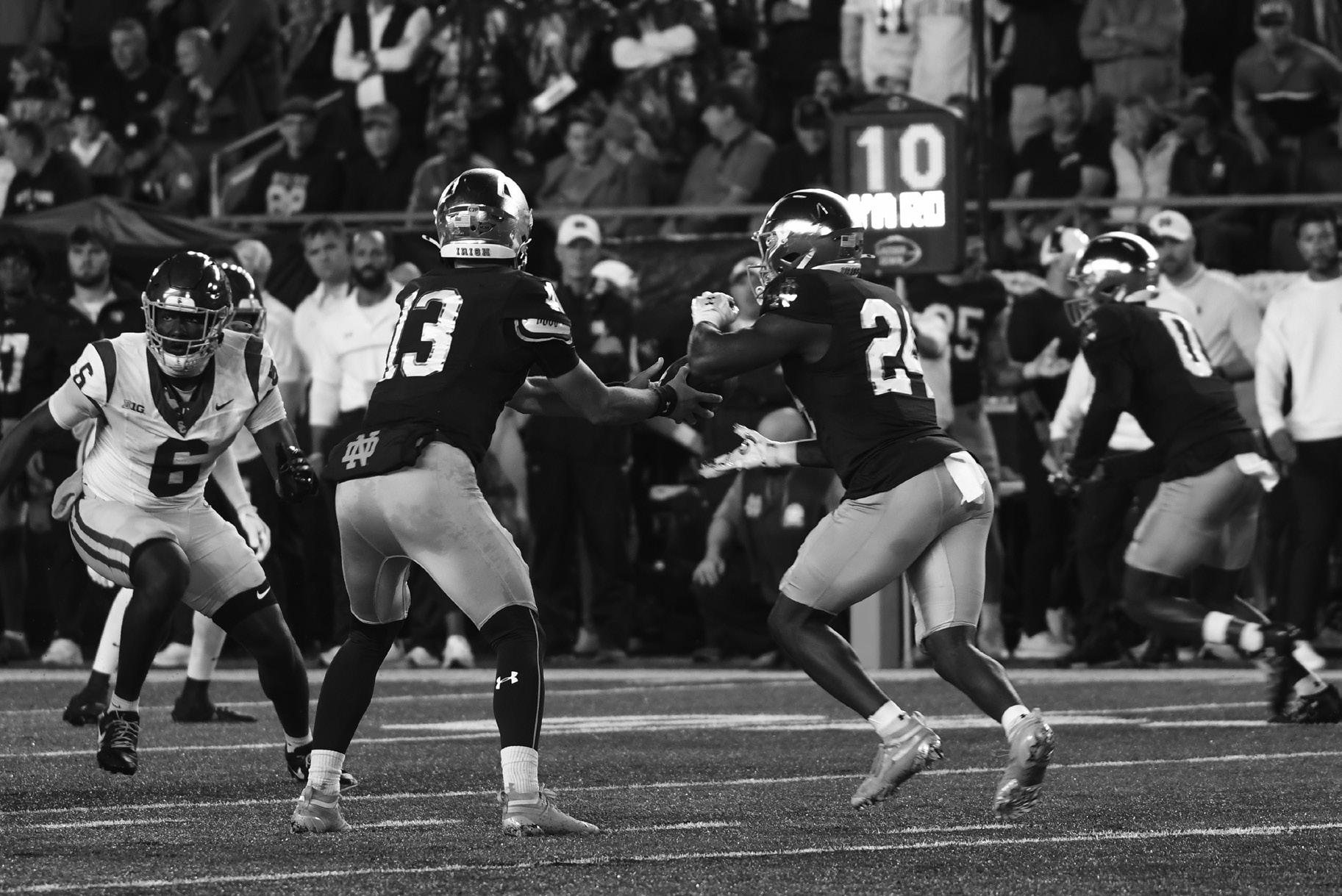 Unfortunately, kickers are mainly mentioned when they fail. But senior Noah Burnette’s missed extra point and missed field goal and freshman Erik Schmidt’s two out-of-bounds kickoffs could have been costly in the Irish win. Maybe it was the rainy weather, remnants of Burnette’s hip injury or even a holder issue — whatever it was, it needs to be corrected before Saturday. The Irish likely will need to rely on Burnette’s and Schmidt’s legs at some point in a high-leverage spot in order to go on a playoff run.