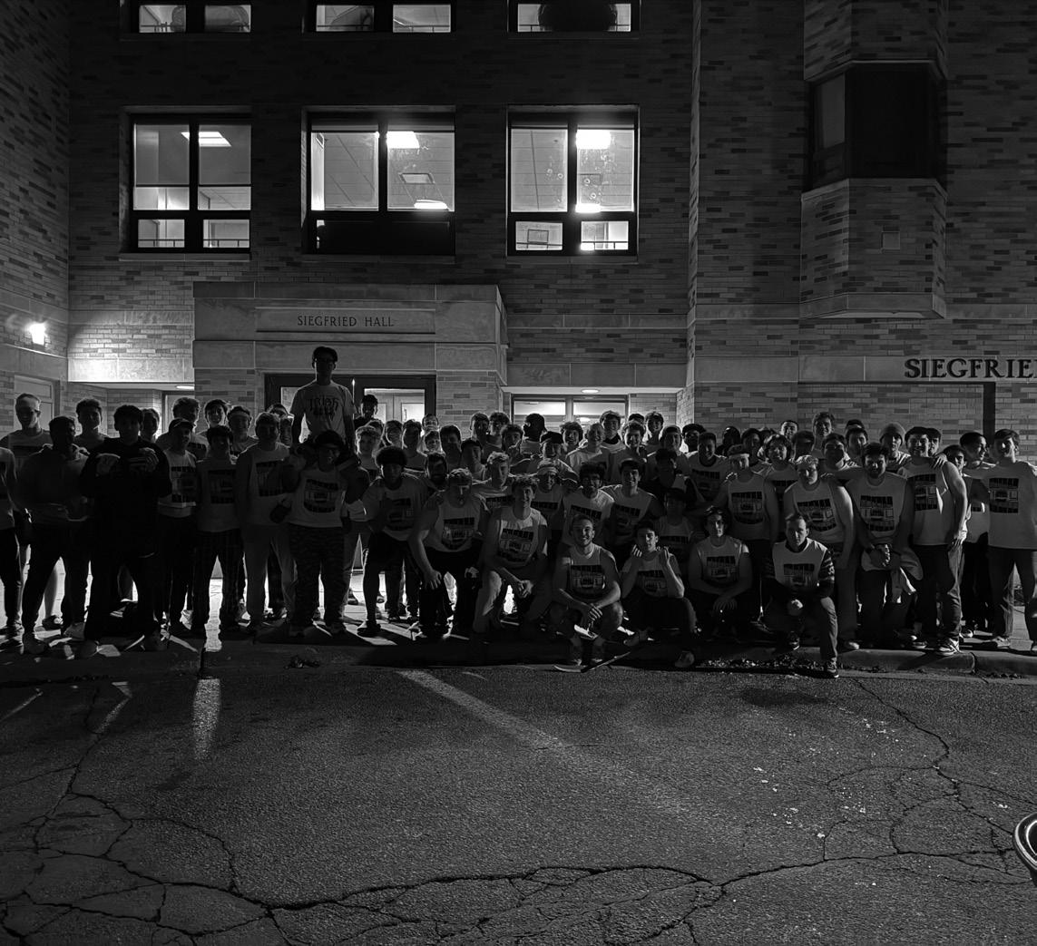 Residents of Siegfried Hall pose outside thier dorm at the end of their annual Day of Man homeless fundraiser event on Feb. 5.