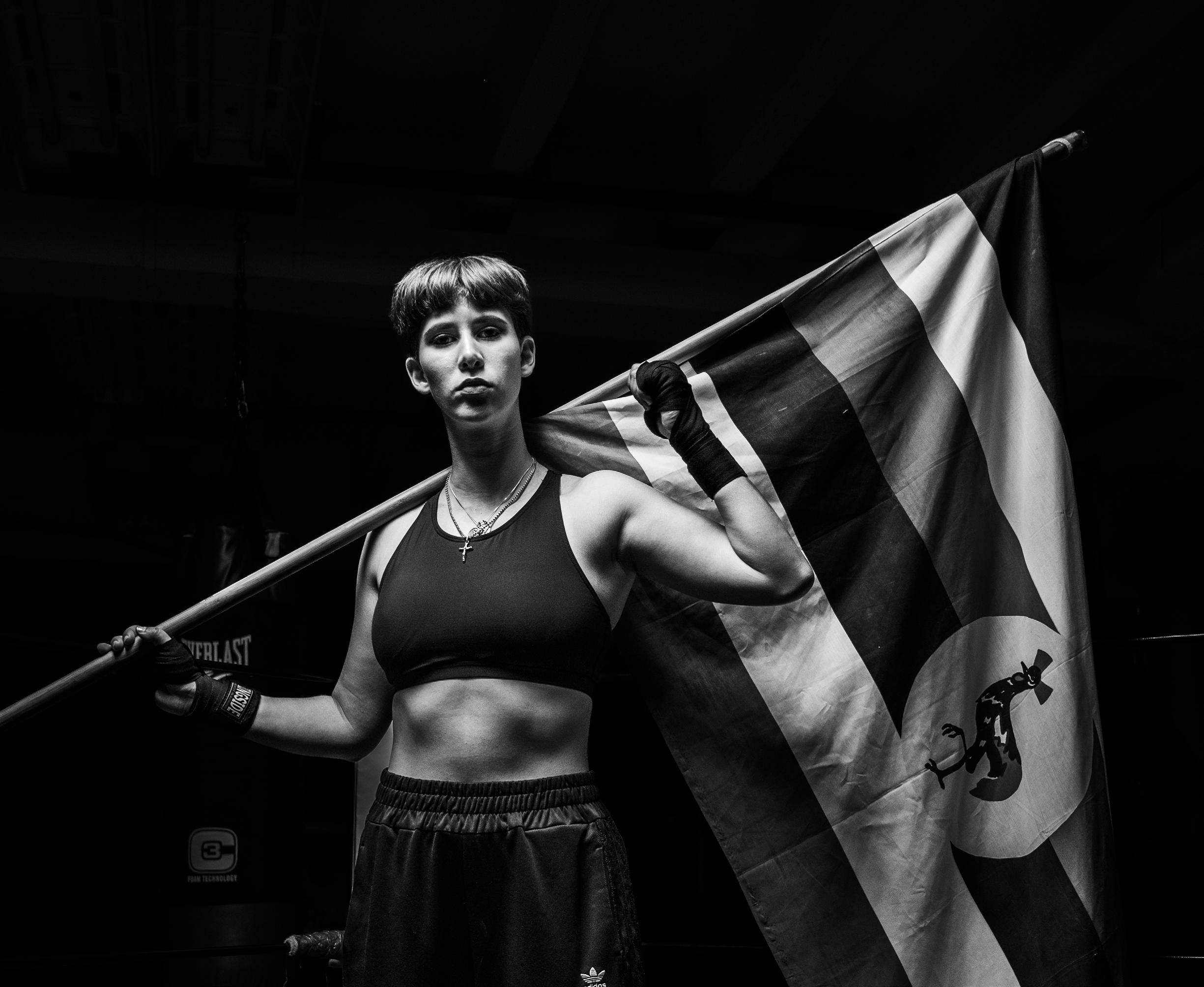 Baraka Bouts senior captain, Ocean Leto, holds the Uganda flag over her shoulder. Baraka Bouts has been hosting its annual boxing tournament since 1997 and supports funding for schools in Uganda each year. As a captain, Leto works to craft and guide the club’s movement training.