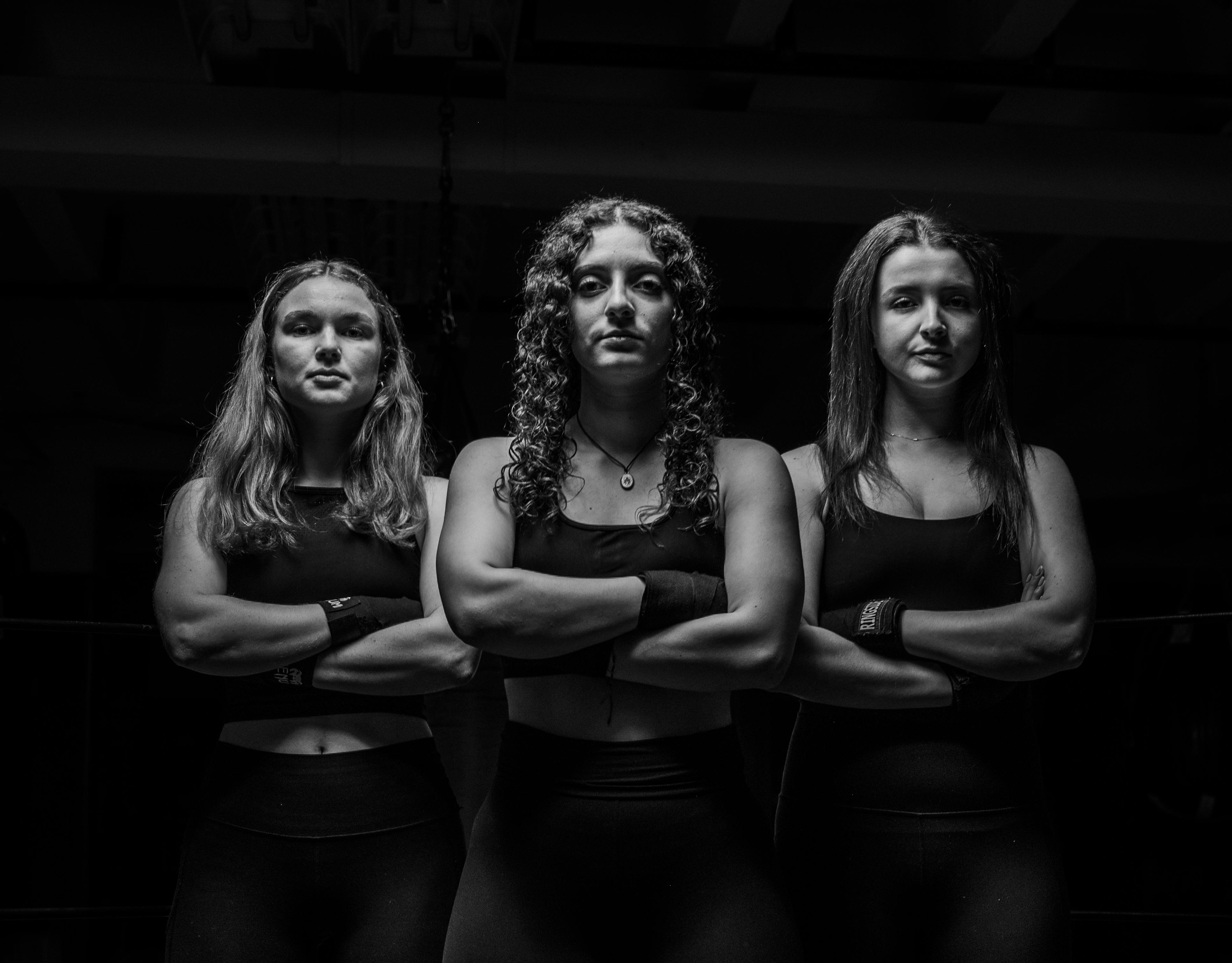 From left to right, Rosie Binette, Kylie Reese and Kiska Porter stand together; Binette and Porter are the junior captains for this year’s 23rd annual Baraka Bouts. The duo has put an emphasis on the club’s charitable purposes, growth of relationships and participant empowerment.