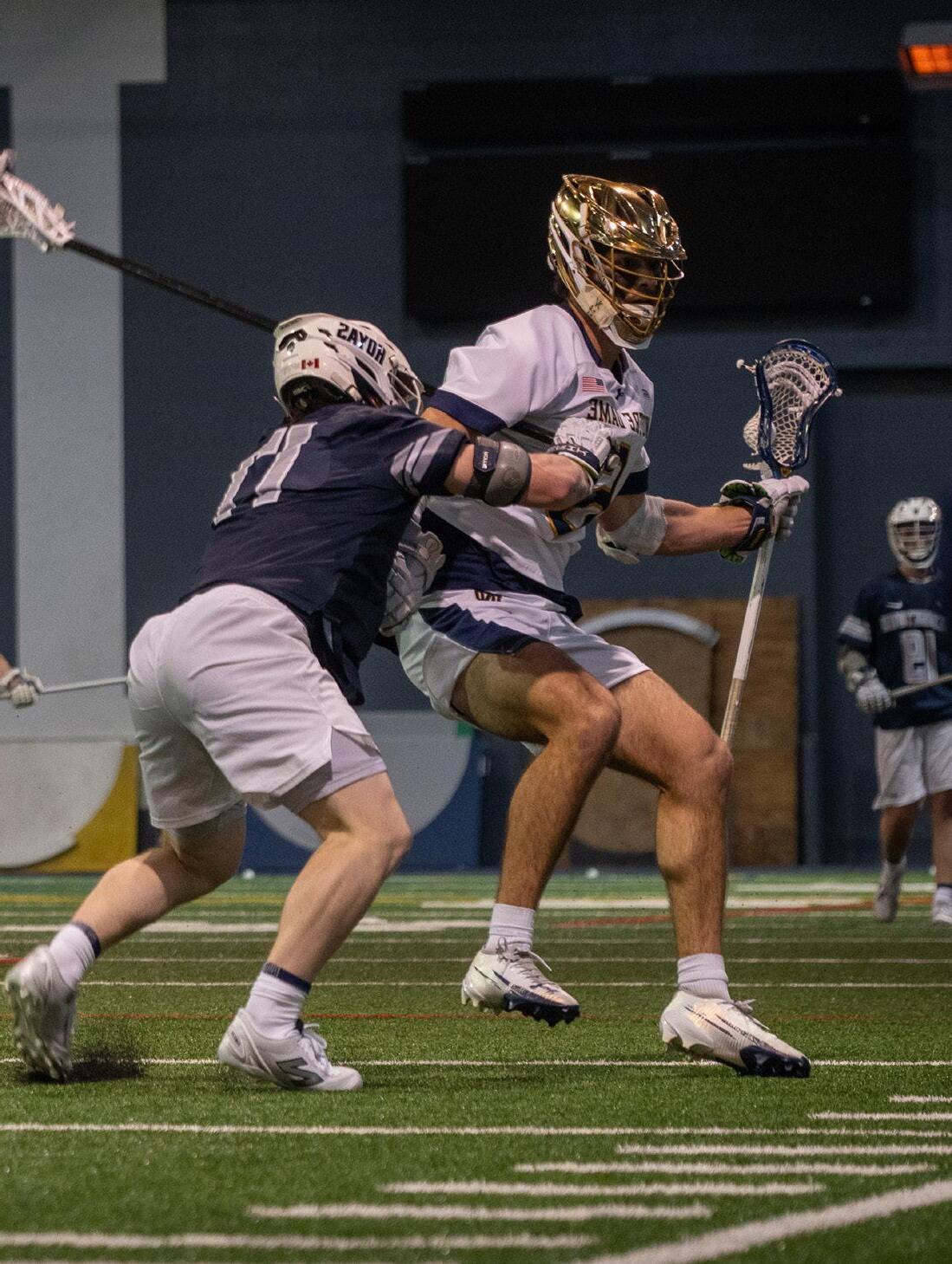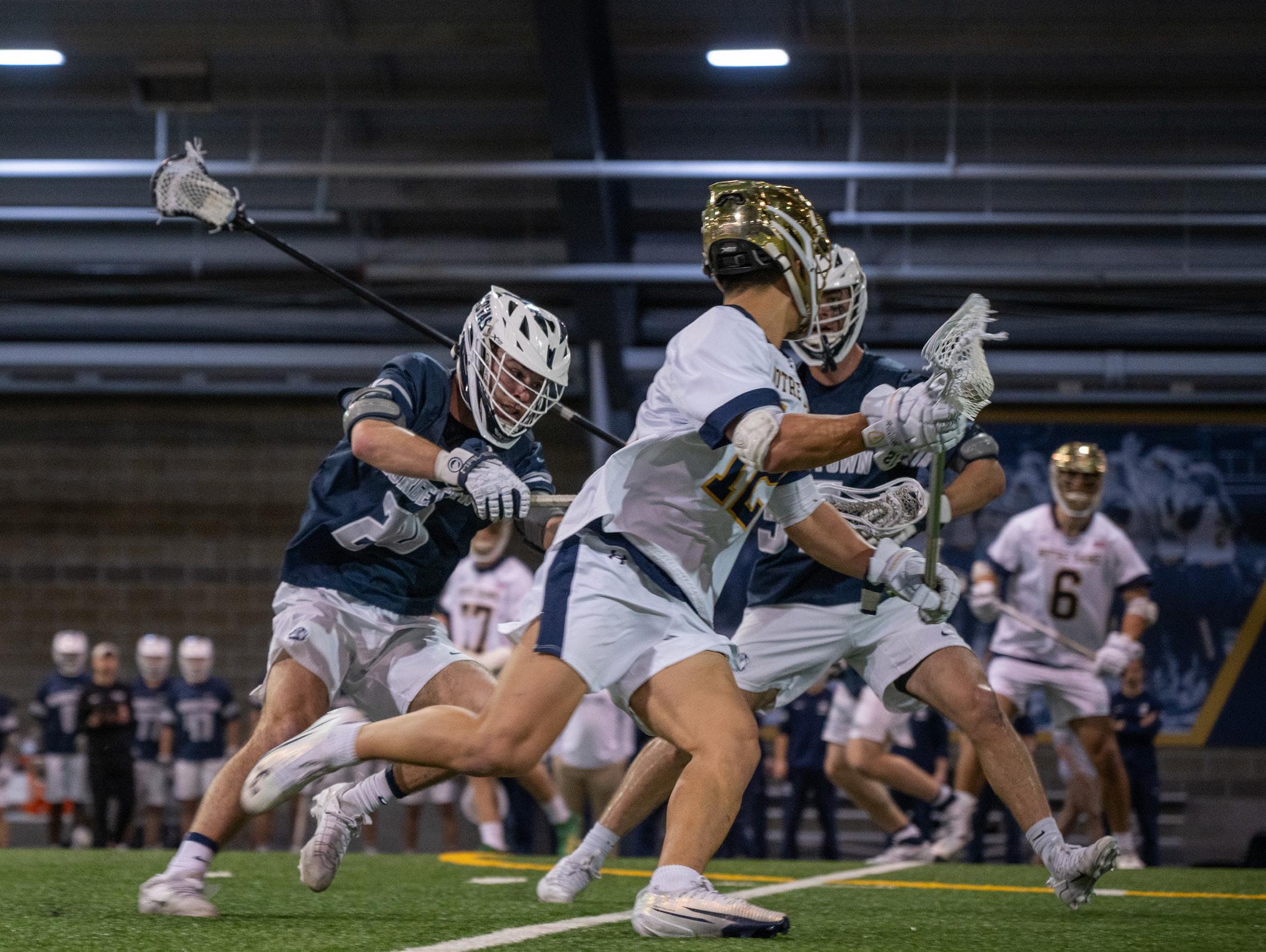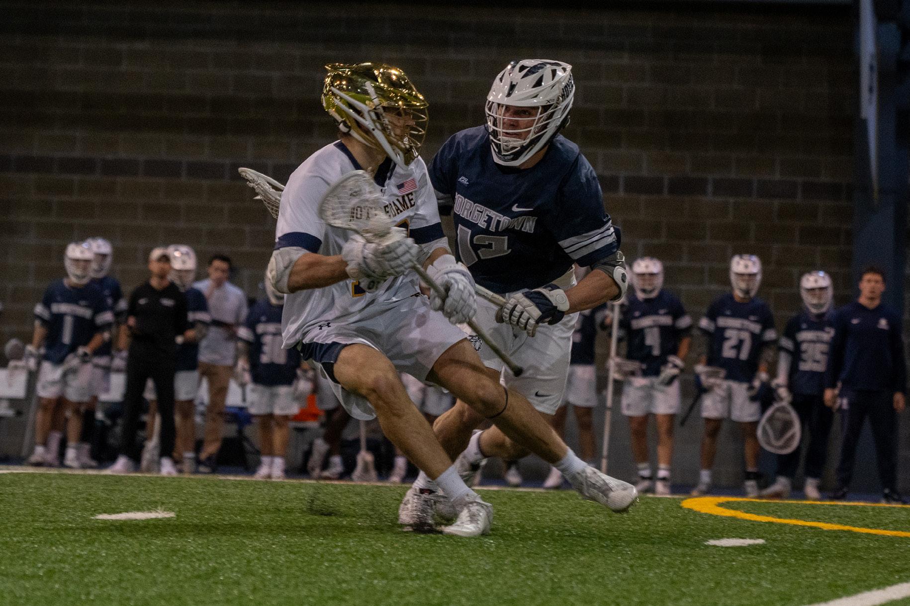 The Notre Dame men’s lacrosse team came away with a 15-9 victory against the Georgetown Hoyas in a highly anticipated ranked battle at the Loftus Sports Center on Sunday. The Irish came into the match ranked No. 7 by Inside Lacrosse, while the Hoyas were ranked No. 4. This result, along with others in college lacrosse this week, has the chance to really shake up the rankings.