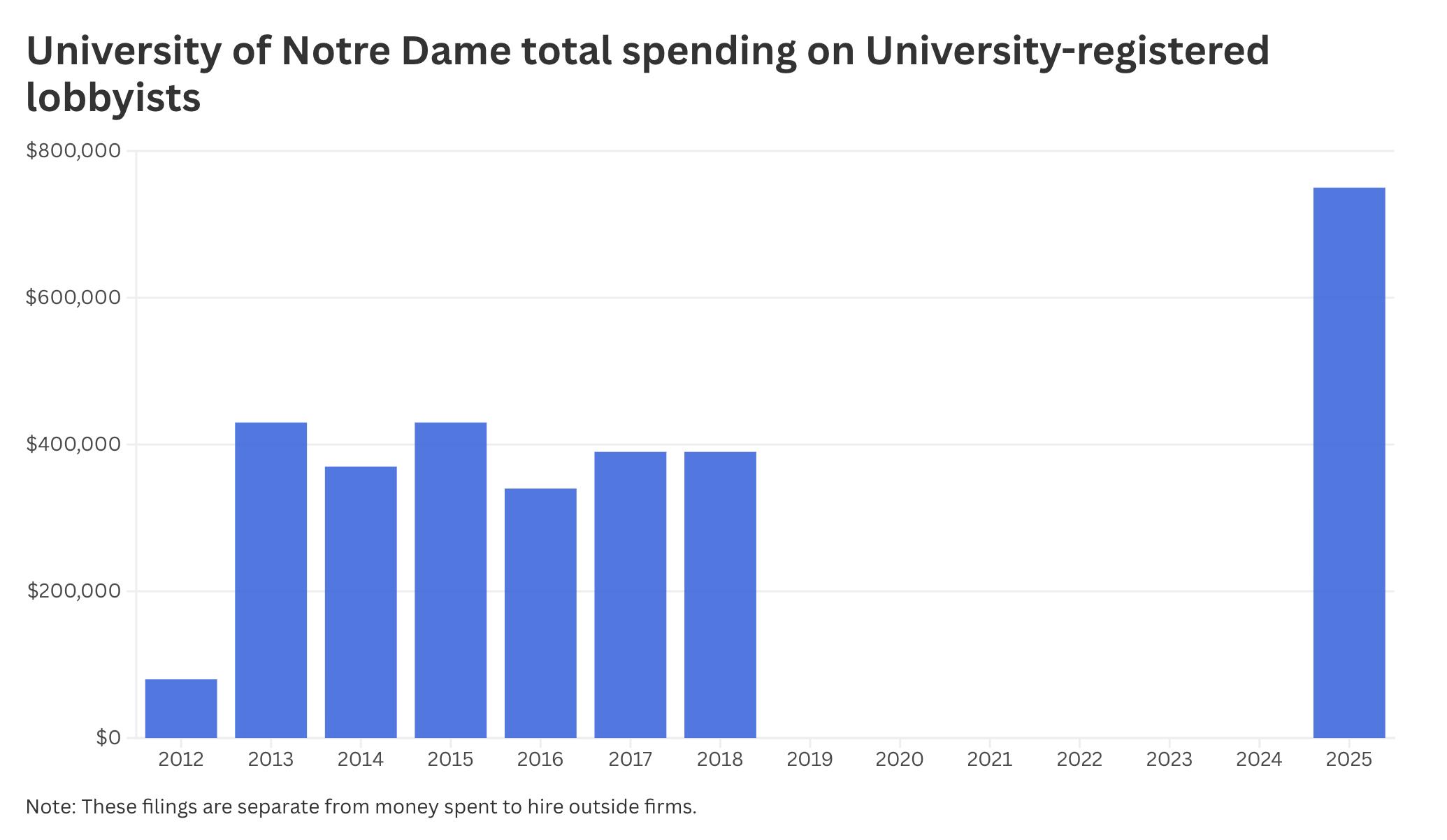 Government Affairs. In 2025, Notre Dame decreased its spending at both firms, spending $240,000 and $140,000 at each firm, respectively.