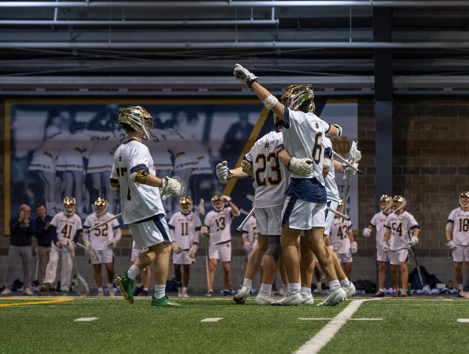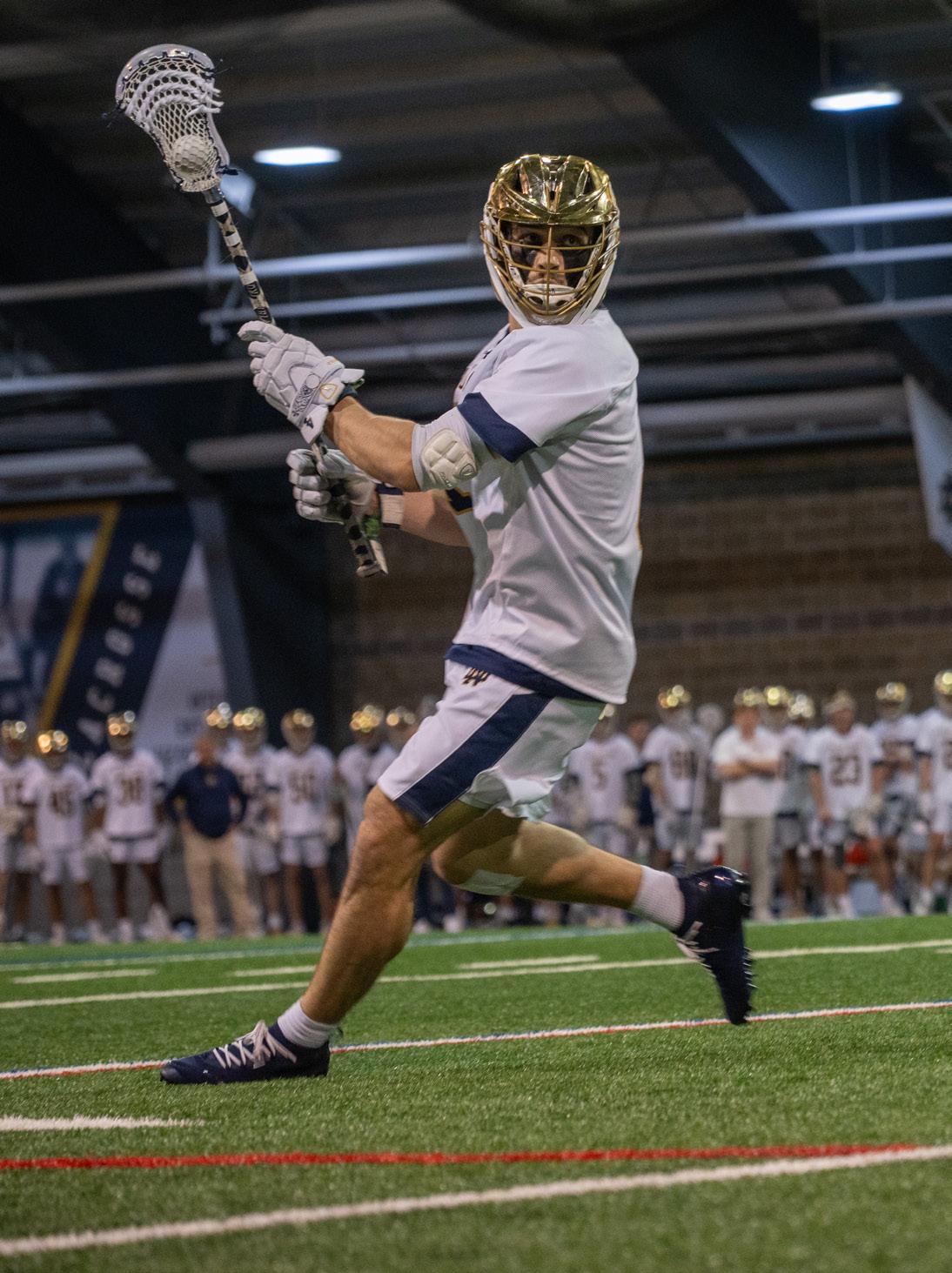 at three. Freshman FOGO Aidan Diaz-Matos won the faceoff, passed it to graduate attackman Josh Yago, and Yago got it to freshman midfielder Miguel Iglesias, who converted on the shot attempt to tie it up. It ended the Irish’s 11-minute scoring drought, and from that point, the Irish didn’t look back. The Irish went on a 5-1 scoring run to end the second quarter, getting a goal from graduate midfielder Will Angrick, freshman attackman Teddy Lally, junior midfielder Brock Behrman, and two goals from Yago. Angrick, Lally and Yago also picked up assists in that stretch. The Irish went into the halftime locker room up 8-4.