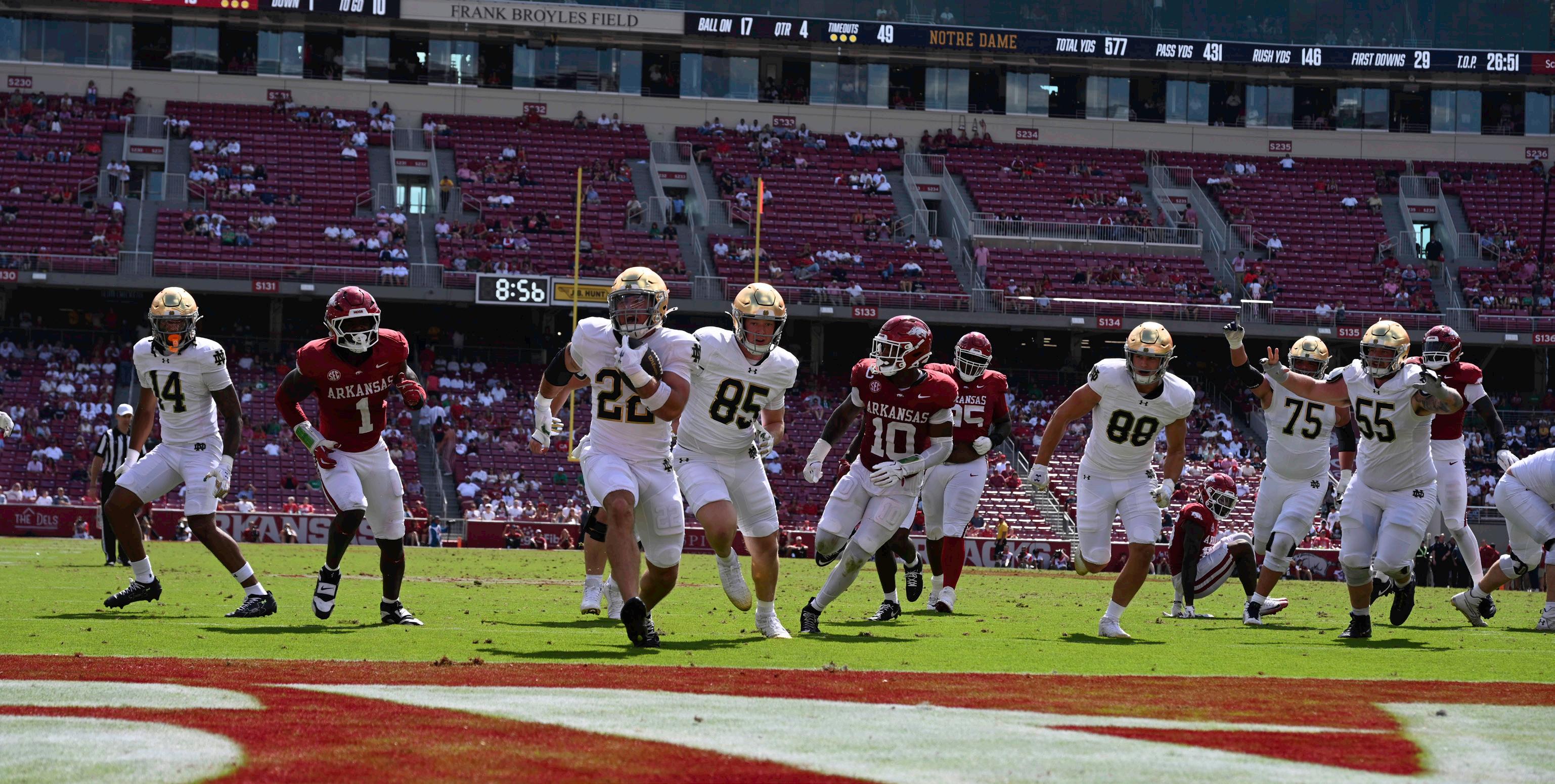 an offense that has strung together 24, 40, and 56 points twice to start the year. Faison has been Notre Dame’s leading receiver in both of their two wins and leads the team with 19 receptions. Faison was also the team’s second-leading passer against Arkansas. He earned that mark on a successful fake punt trick play for 40 yards called by Freeman to open up the second half.