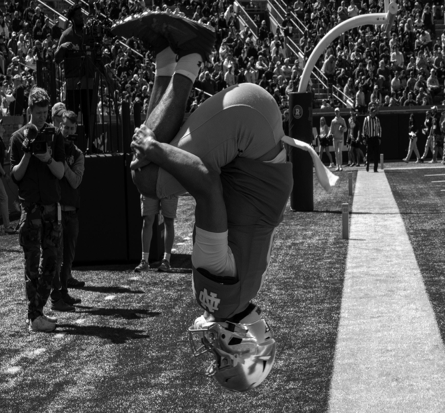 Rising sophomore quarterback CJ Carr stretches before the Blue-Gold Game at Notre Dame Stadium on April 12, 2025. Carr finished with 170 passing yards and two touchdowns on 14 completions in the game.