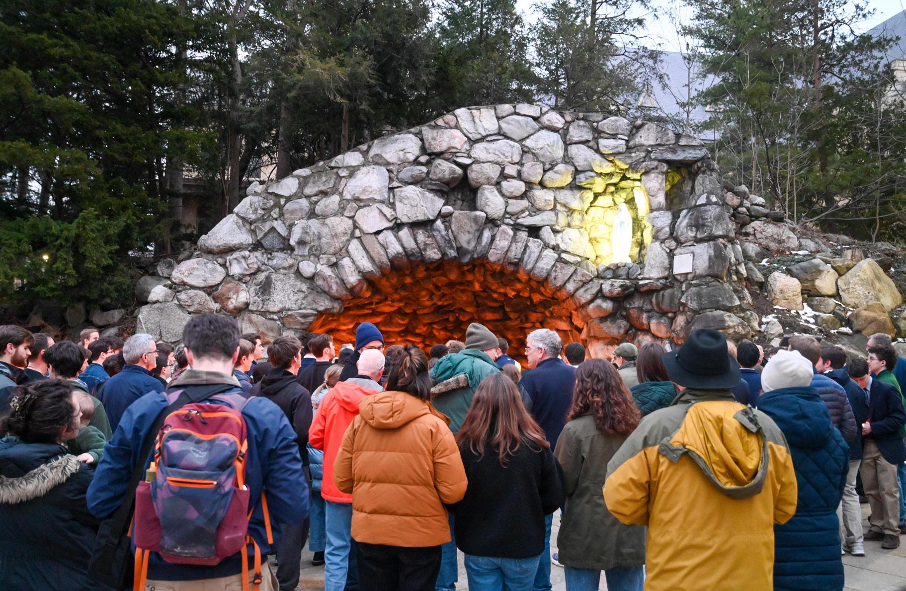 About 150 people gathered at the Grotto to pray in thanksgiving for the Catholic mission of the University of Notre Dame prevailing in the wake of Susan Ostermann declining the directorship of the Liu Institute.