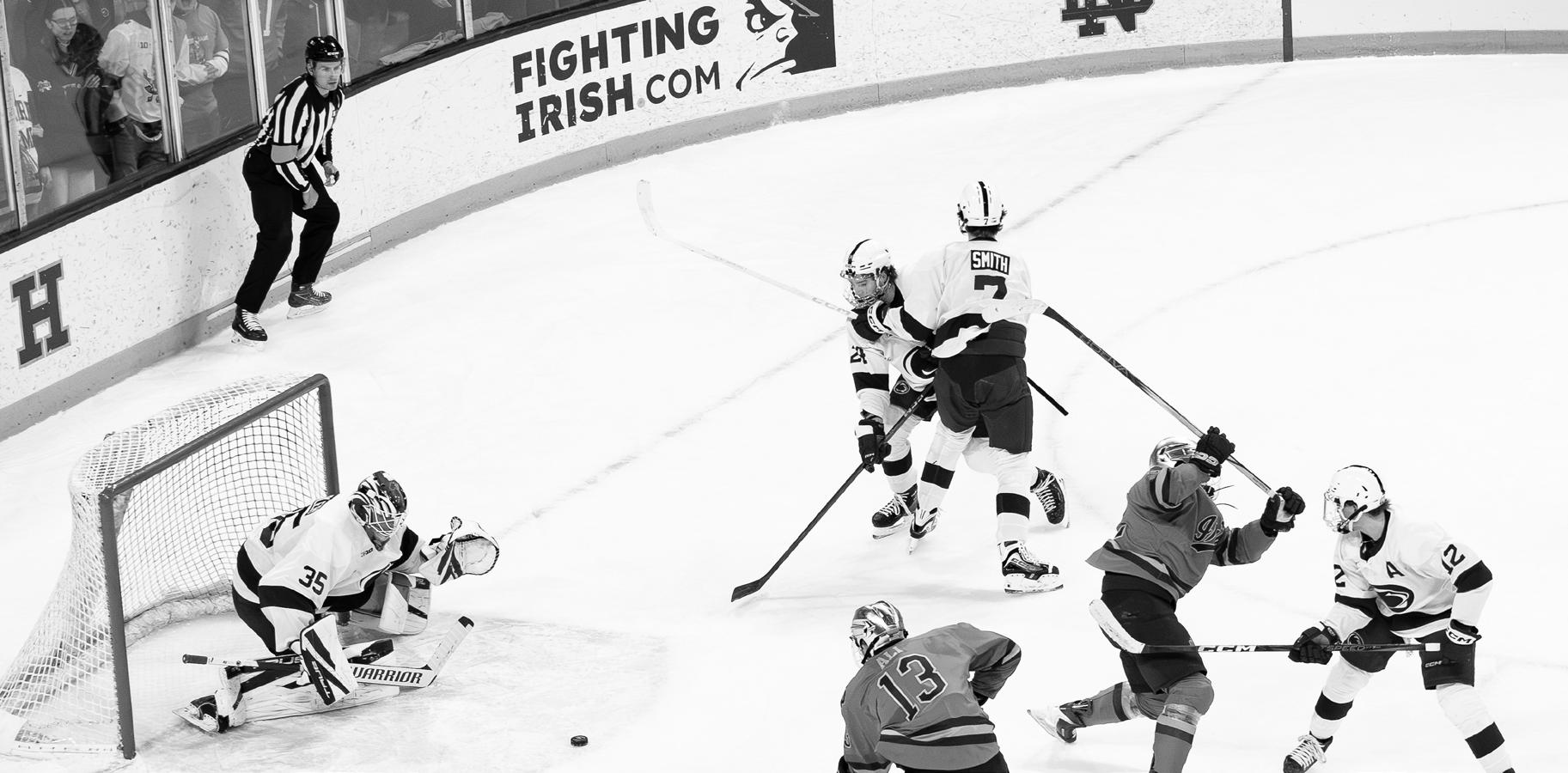 McKenna made an errant pass. Irish junior forward Cole Knuble, a factor all night, tracked it down in the Nittany Lion zone. He passed to Kumlin at the faceoff circle, but his shot was easily stopped by Reidler. Kumlin jarred the rebound free. Muzzatti picked it up on the near post, just as Kumlin got his stick free on the far post. One pass. One shot. Kumlin did not miss.