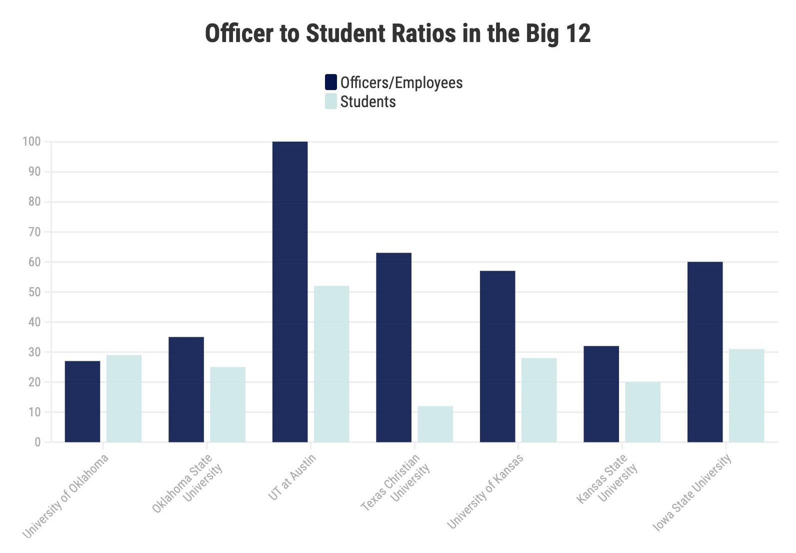 Compared to some Big 12 schools, only OU has a ratio of more than 1,000 students per offi cer. However, among the 10 schools in the con ference, only six campus police departments list employment numbers online. OU is not one of them.