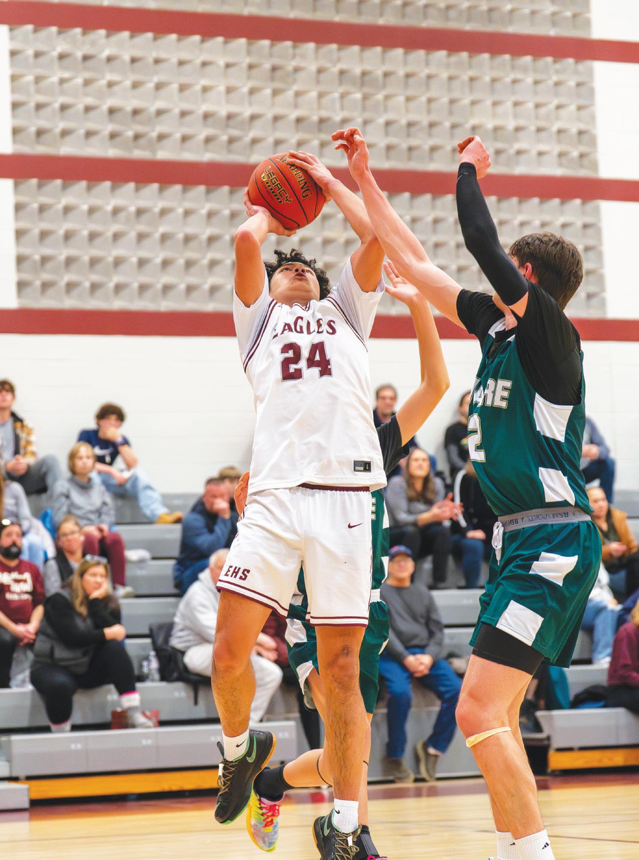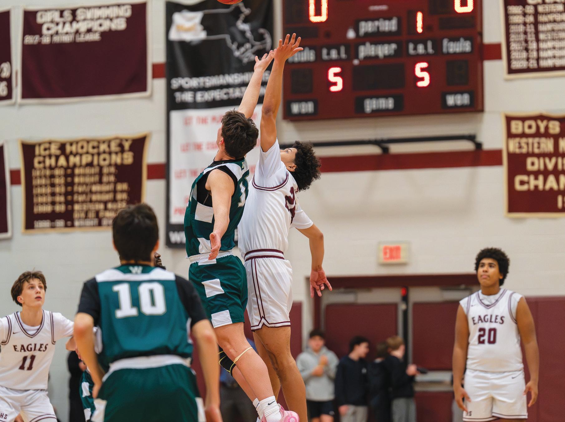 Patrick Larson jumps in the air to get the pass of while being defended by two Ware players.