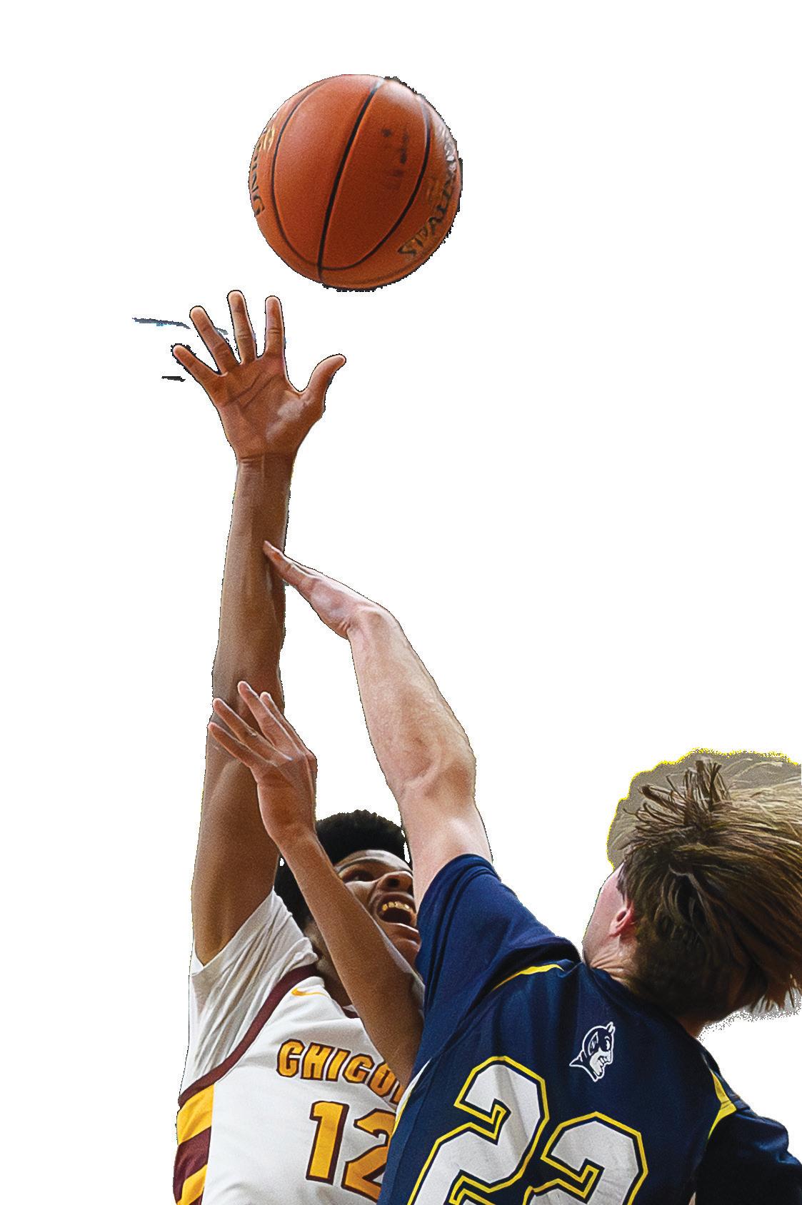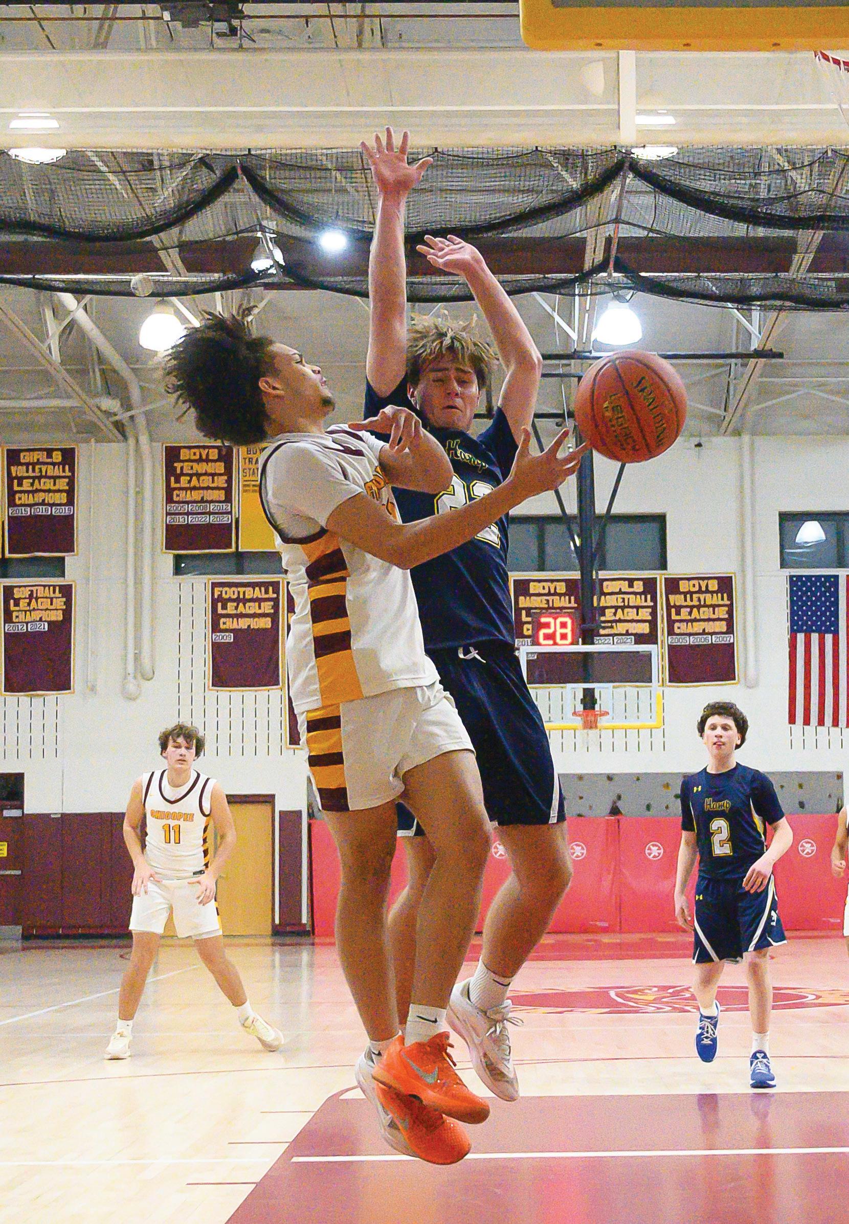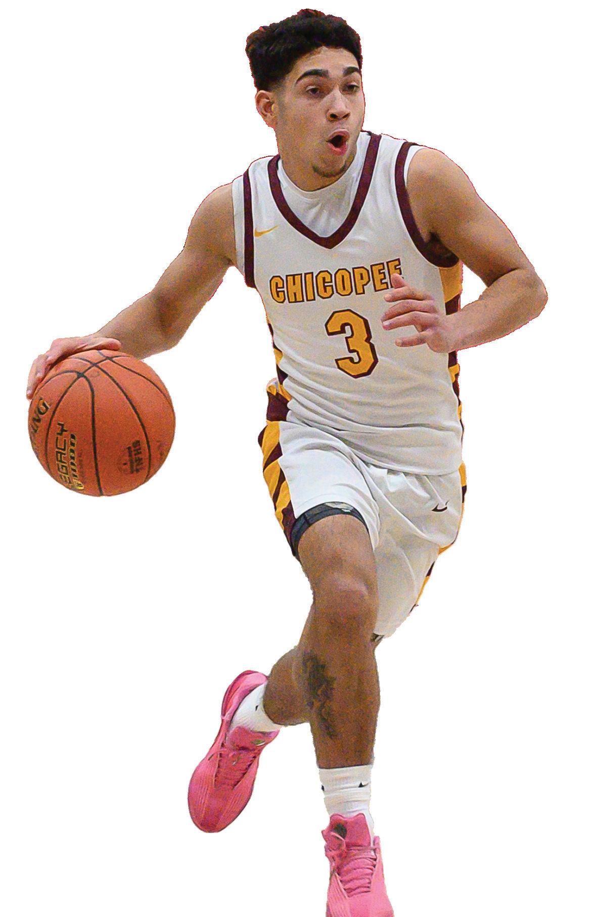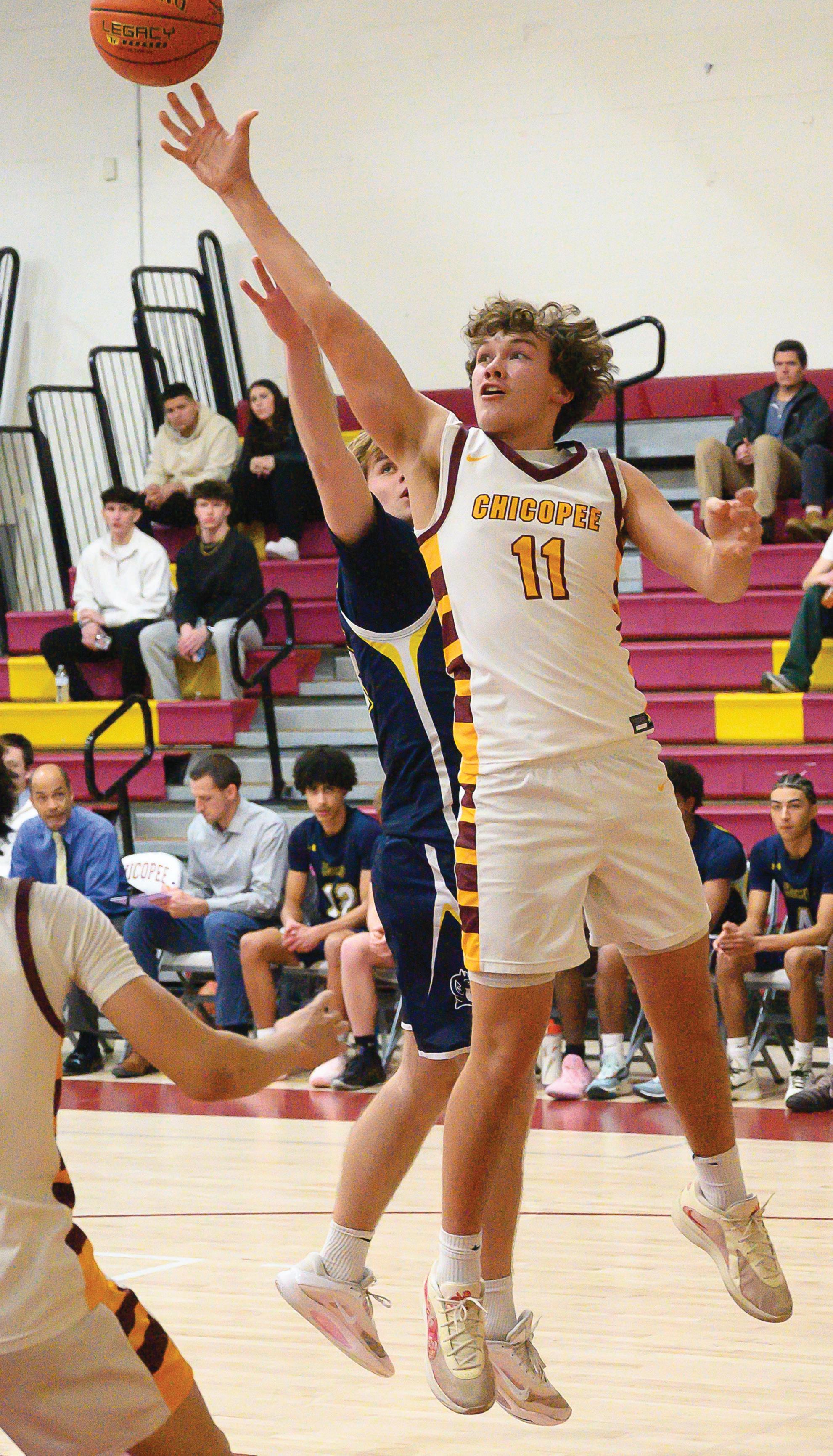 Chicopee’s Robert Espiritusanto tosses up a shot, guarded by Eli Reid.