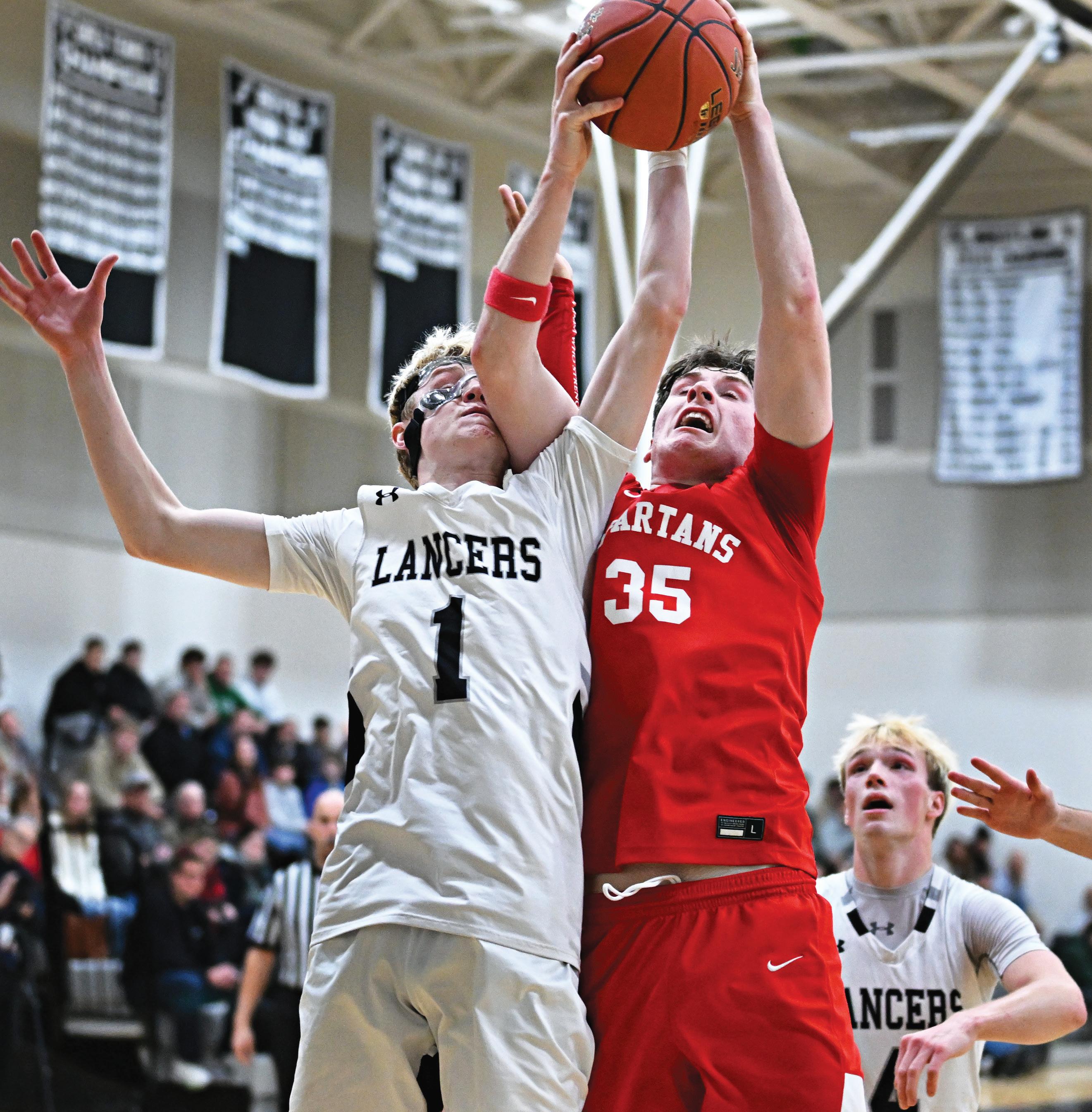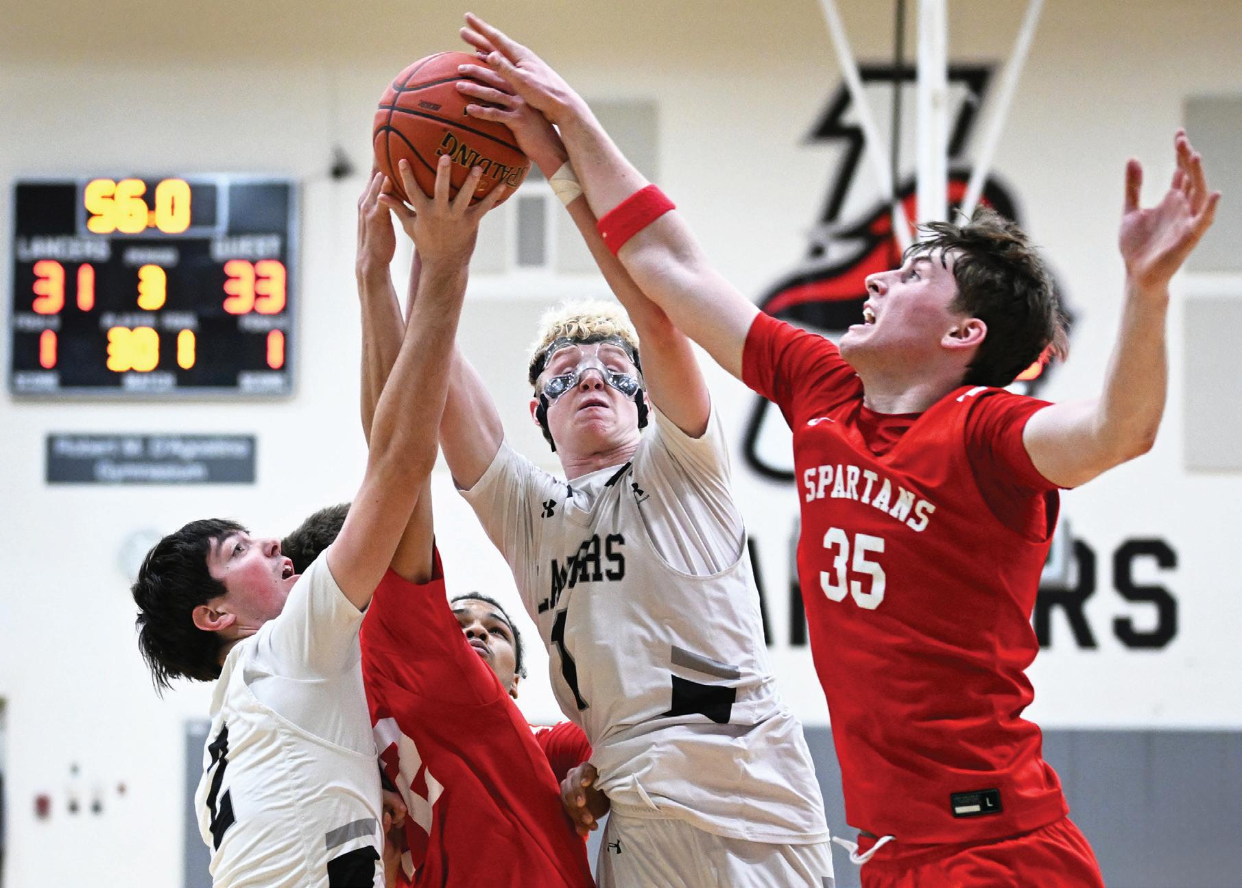 East Longmeadow’s Nolan Garstka vies for the rebound versus Sam Tyson.