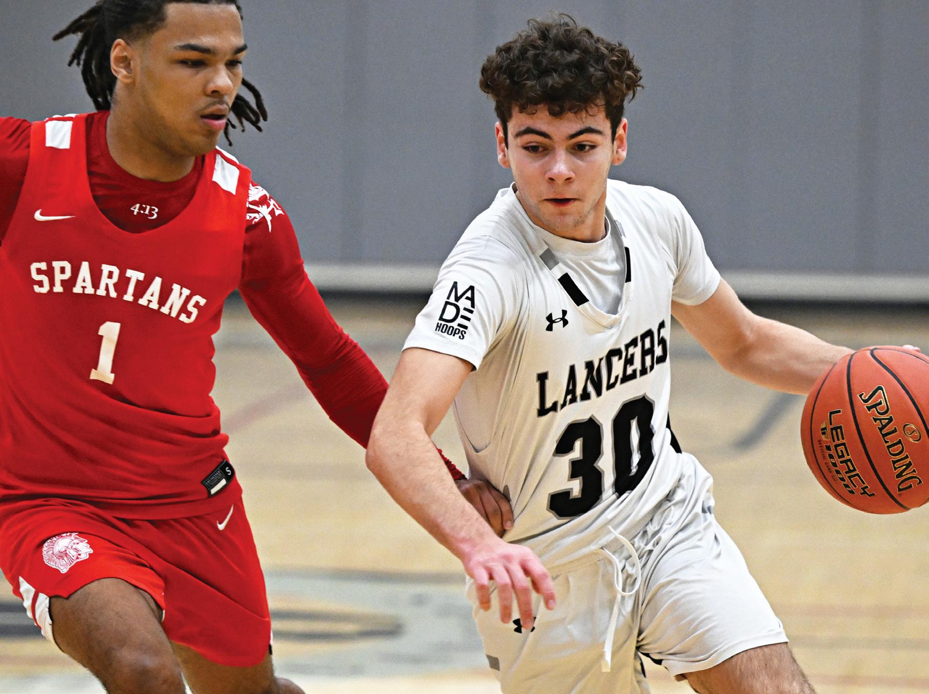 The Lancers’ Joe Martinez attacks the basket as Noah Enriquez-Davis from East Longmeadow defends.