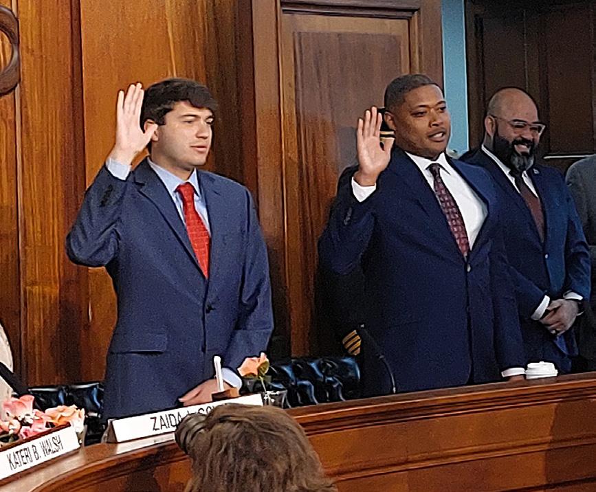 From left: Tracye Whitfield smiles from the podium as she is nominated by her peers to serve as City Council president. City Councilors Gerry Martin and Justin Hurst are sworn in.