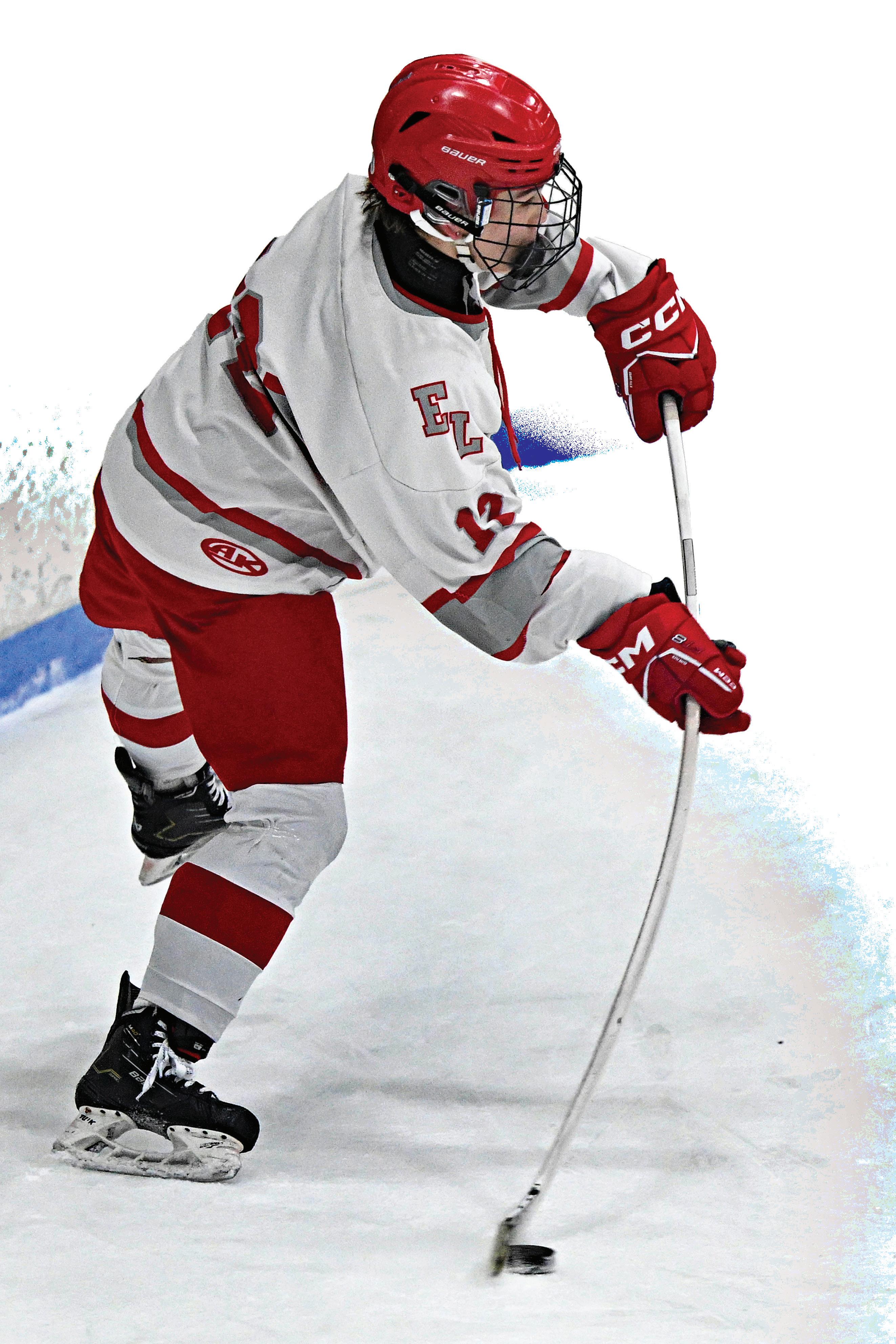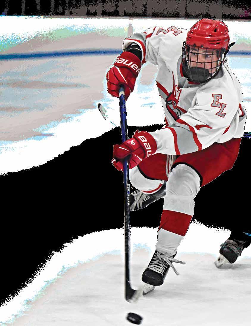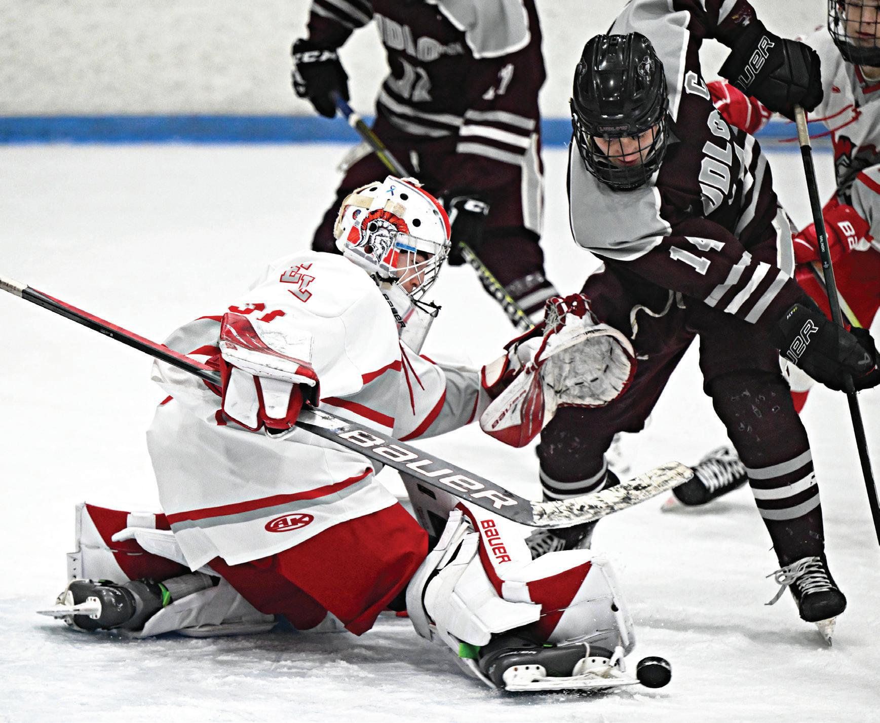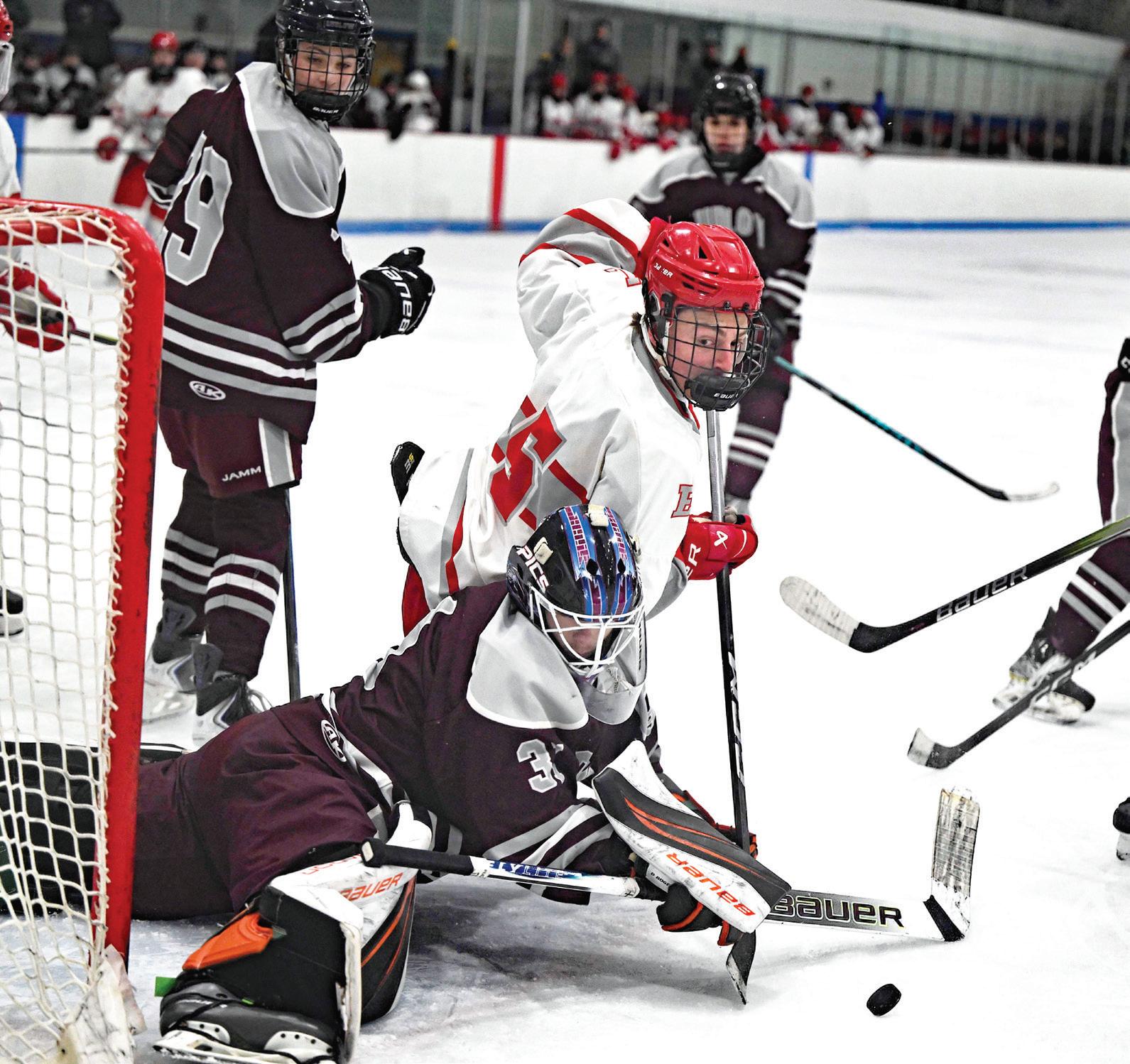 EL’s Joe Mazza looks to score on the rebound but Ludlow goalie Donald Rogers deflects the puck toward the corner.