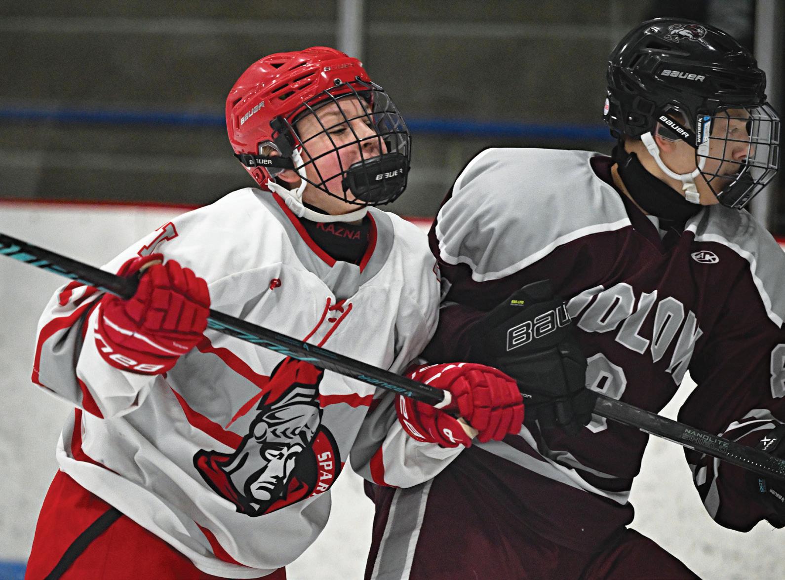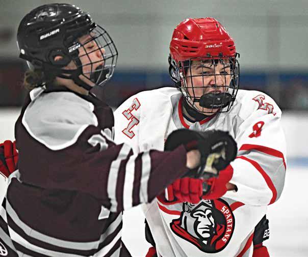 East Longmeadow’s Keller Reid (R) and Ludlow’s Connor Kokosa jostle for position in front of the Spartans net.