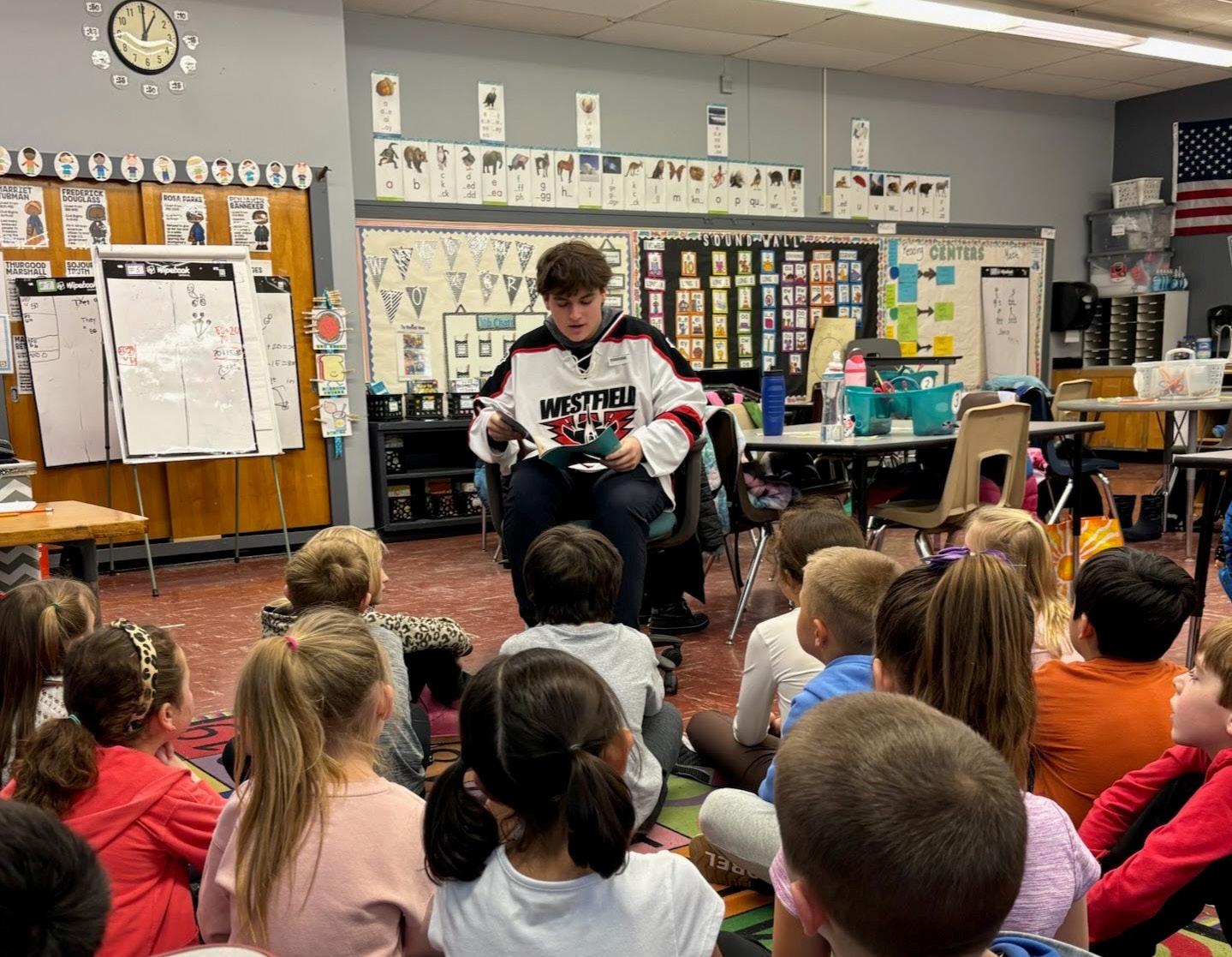 High school hockey team visits elementary school students