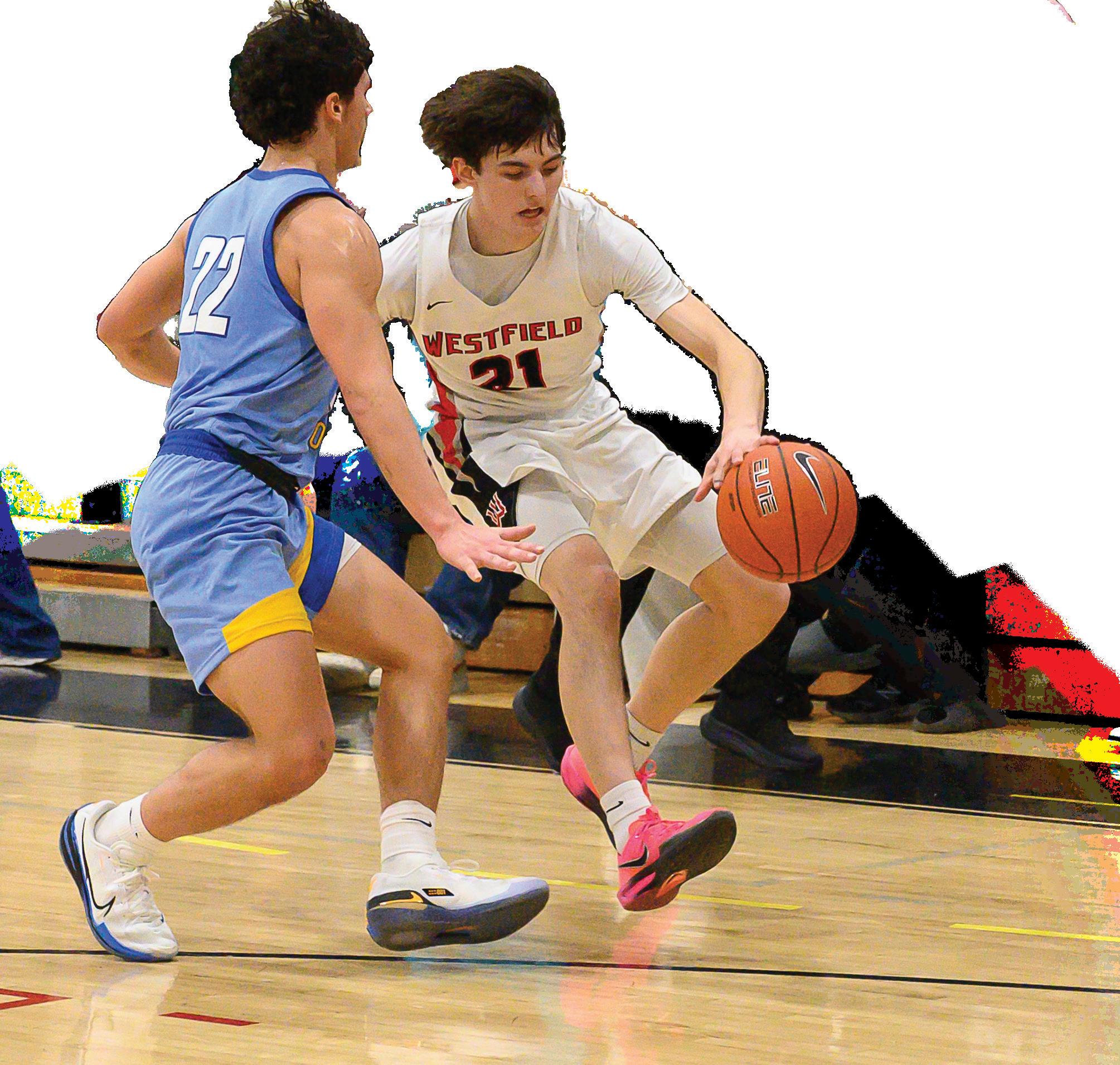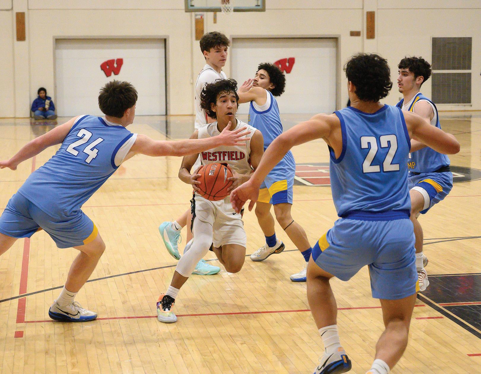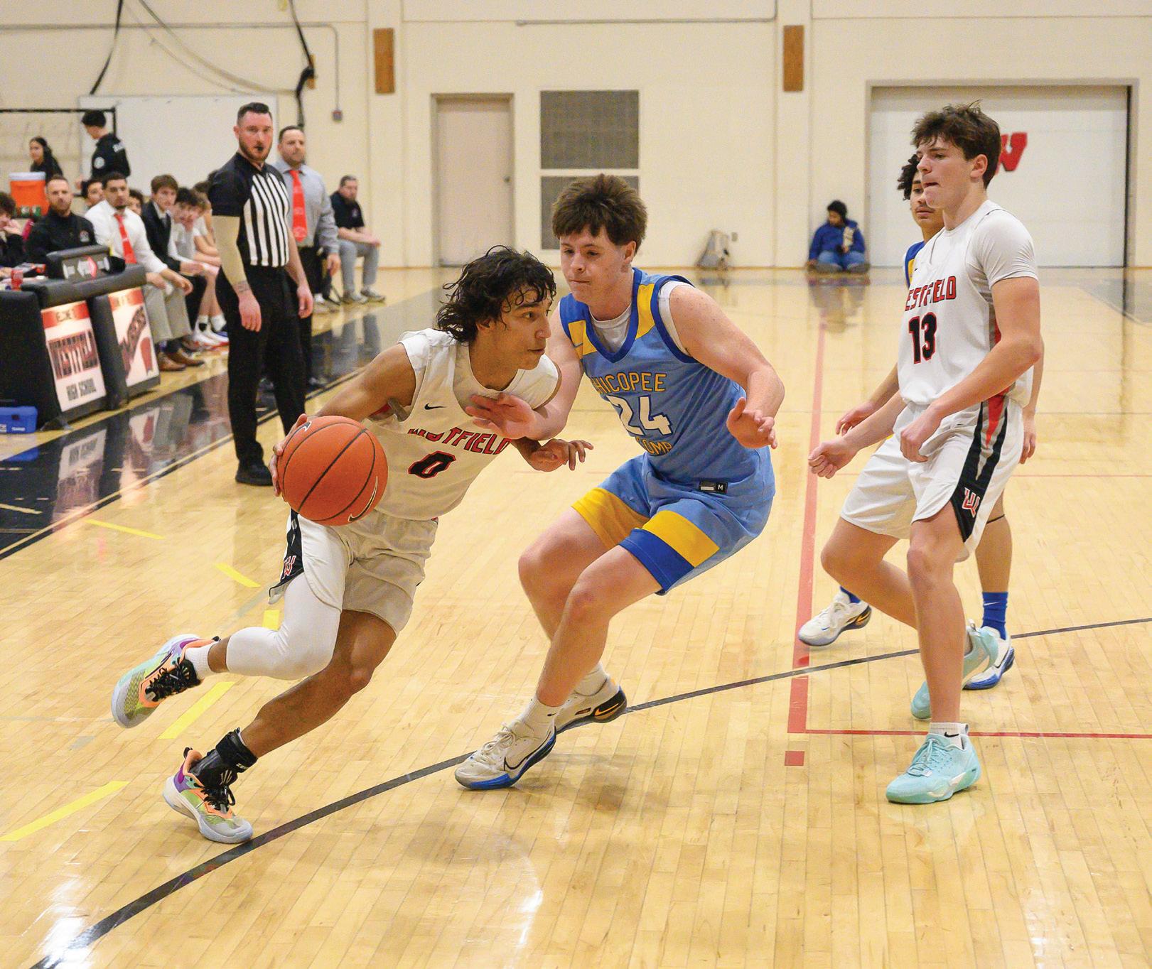 Westfield's Maiki Gomez drives around Jacoby Haney with Garrett Berube setting a pick. WESTFIELD HIGH VS CHICOPEE COMP