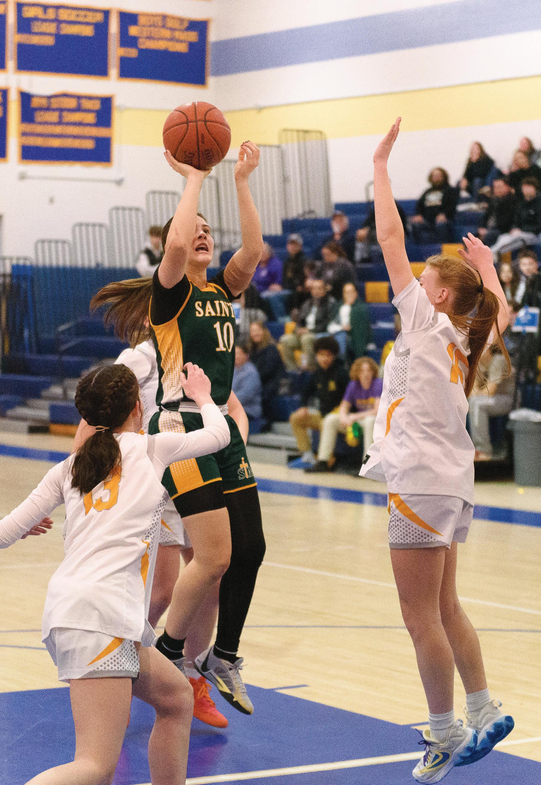 Saints' Josephine Hicks slips past Colts guarding her.