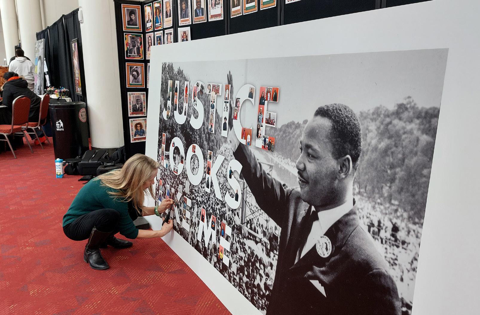 Top row, from left: A booth for the Executive Office of Veterans Services is set up next to a booth selling T-shirts. Someone adds a photo to an oversized piece of artwork with the message, “Justice looks like me.” Bottom, Artist Frankie Borrero works on a painting at a booth at the Martin Luther King Jr. Day celebration.