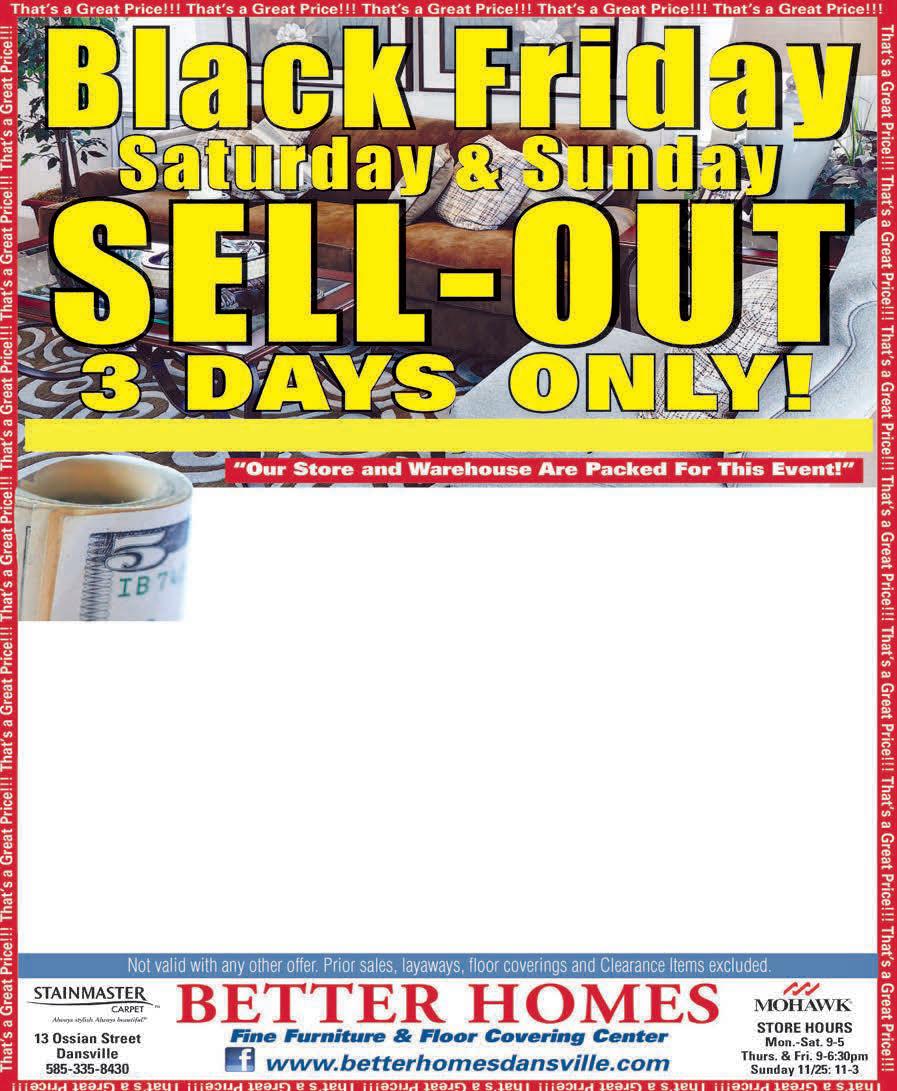 2 SOUTHERN TIER SHOPPER TUESDAY, NOVEMBER 22, 2022 OVER 23,500+ CIRCULATION Southern Tier Hearing Services offering the best in hearing health care 7433 Route 54, Bath, NY • 607-776-1200 Hearing evaluations, hearing aid sales, repair and service. Medicare and other insurance accepted. E-mail: dr.narby@live.com Website: www.dnarby.com Hours: Mon & Wed 9 am-5 pm; Tues 9 am-3 pm; Fri 9 am-4 pm Your LOCAL Hearin g Care Provider Dr. Susan B. Narby Caring Professional Trusted Time to get your hearing tested? That’s a great price! That’s a great price! That’s a great price! That’s a great price! That’s a great price! STORE HOURS Mon.-Sat. 9-5 Thurs. & Fri. 9-6:30 Sunday 11/27: 11-3 25% DOWN Holds Your Order ‘Till Christmas From Canisteo to Geneseo, Mt. Morris to Bath, WE DELIVER! ALL IN STOCK & CUSTOM ORDER FURNITURE! BETTER HOMES GIVES YOU AN INSTANT 8% DISCOUNT OFF YOUR NEW FURNITURE SUPER SALE PRICE!! Friday 11/25, Saturday 11/26, Sunday 11/27 PLUS FREE DELIVERY (Within our normal delivery area) SALE! BLACK FRIDAY, SATURDAY and SUNDAY Jim’s Equipment Repair is donating $100 to the Wounded Warriors Project for every NEW machine sold in November! THANK YOU VETERANS! NOVEMBER SALES EVENT American-Made UTVs $850 INSTANT REBATE ON ALL AVAILABLE MODELS INSTANT REBATE ON ALL AVAILABLE MODELS Bird Seed, Ice Melt, Sleds, Snow Shovels & Portable Heaters, Animal Health, Mineral Mixes, Shavings, Pet Foods, Bulk Feeds, Bagged Feed For Horses, Pigs And Chickens!! 4100 ROUTE 14A • BETWEEN PENN YAN AND DUNDEE JUST SOUTH OF THE WINDMILL • PH: 607.243.7009 42” By 56” Box, Drop Centre Floor, 25 Cubic Foot Cap, Lift Out Tail Gate, AT22x11-8 Knobby ATV Tires ATV 25 Utility Dump Trailer Main Street Almond, New York Mon, Tues, Wed & Fri, 9AM 5PM Thurs, 9AM 6PM • Sat, 9AM 3PM CHECK OUT NRFSELECT.COM FOR A HUGE SELECTION OF PRODUCTS! OVER FIFTEEN DIFFERENT BRANDS AVAILABLE!! Carpet • Hardwood • Vinyls • Laminate 6 0 7.2 76.52 0 0 “DON’T BUY CHEAP FLOORING CHEAP, BUY QUALITY FLOORING CHEAPER!” FREE ESTIMATES!! Largest Selection Of In Stock And Special Order Lock - Together & Glue-Down Waterproof Vinyl Planks and Tiles In The Southern Tier!! Largest Selection Of In Stock And Special Order Lock - Together & Glue-Down Waterproof Vinyl Planks and Tiles In The Southern Tier!! NO TRICKS, NO GIMMICKS... JUST GREAT DEALS!! CARPETOVER500 REMNANTS&VINYL INSTOCK! CHOOSE FROM OVER 400,000 sqft IN STOCK! CHECK OUT NRFSELECT.COM FOR A HUGE SELECTION OF PRODUCTS! FOR SALE: Navy blue couch & love seat, 2 years old; $300.00. Tan rock ing recliner, $30.00. Phone 607-583-4458. FARM FRESH BEEF: