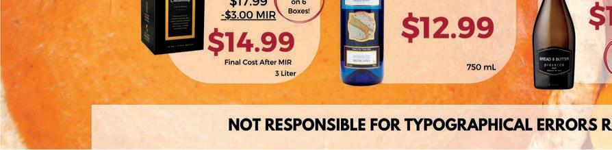 10 SOUTHERN TIER SHOPPER TUESDAY, NOVEMBER 22, 2022 OVER 23,500+ CIRCULATION Chips and Snacks Chips and Snacks MORGAN’S MORGAN’S 315-536-6612 YOU CAN BUY JUST 1 AND RECEIVE SALE PRICE!! morgansgrocery@gmail.com EVERY DAY SPECIALS TACO SALAD $9.99 CHILI DOG $7.99 MONDAY SPECIALS MACARONI & CHEESE $11.99 MEATLOAF & MASHED POTATOES $12.99 CUBE STEAK SANDWICH (PHILLY CHEESE) $9.49 TUESDAY SPECIALS HAMBURG & SALT POTATOES 1/4 LB. $6.99......... 1/2 LB. $8.99 SLOPPY JOES W/ MACARONI SALAD $9.99 ITALIAN SAUSAGE W/PEPPERS & ONIONS $7.99 POT ROAST W/ BOILED POTATOES, VEGGIE, GRAVY $12.99 WEDNESDAY SPECIALS CHICKEN & BISCUITS $11.99 BARBECUE CHICKEN SANDWICH W/MACARONI SALAD $8.99 MEATBALL TORPEDO $8.99 THURSDAY SPECIALS GOULASH $9.99 CHICKEN PARMESAN $11.99 CHICKEN QUESADILLA W/ TORTILLA CHIPS $10.99 PULLED PORK SANDWICH W/ MACARONI SALAD $9.99 FRIDAY SPECIALS PRIME RIB, MASHED POTATOES, GRAVY............... SINGLE $23.99 DOUBLE $33.99 GARLIC & HERB FISH SANDWICH $8.99 ROAST TURKEY, POTATOES, DRESSING $12.99 LEMON & BUTTER BROILED HADDOCK W/ SLAW $10.49 TACO SALAD $9.99 SATURDAY & SUNDAY SPECIALS HOT TURKEY SANDWICH W/ POTATOES $11.99 HOT HAMBURGER, POTATOES, GRAVY $11.99 Let M makegan’s dinny with e of these specials! BUSCH REG. & LIGHT 30 PK/12 OZ. CANS + tax & dep. $21.49 GENNY LIGHT 30 PK/12 OZ. CANS + tax & dep. $18.49 OLD MILWAUKEE REG. & LIGHT 30 PK/12 OZ. CANS + tax & dep. $18.49 MILWAUKEE BEST REG, LIGHT & ICE 30 PK/12 OZ. CANS + tax & dep. $18.49 MICHELOB ULTRA BEER 24 PK/12 OZ. CANS + tax & dep. $23.99 MILLER HIGH LIFE BEER 30 PK/12 OZ. CANS + tax & dep. $19.99 LABATT BLUE REG. & LIGHT BEER 30 PK/12 OZ. CANS + tax & dep. $24.99 COORS BANQUET & LIGHT BEER 30 PK/12 OZ. CANS + tax & dep. $24.99 MILLER LIGHT BEER 30 PK/12 OZ. CANS + tax & dep. $24.99 KEYSTONE LIGHT BEER 30 PK/12 OZ. CANS + tax & dep. $18.49 KEYSTONE LIGHT & ICE BEER 15 PK/12 OZ. CANS + tax & dep. ................................................... $8.99 MICHELOB ULTRA BEER 18 PK/12 OZ. CANS + tax & dep. $18.99 BUD & BUD LIGHT BEER 18 PK/12 OZ. CANS + tax & dep. $17.89 Sale Dates: Mon. 11/21 - Sun. 11/27 16 OZ. CANS ASST. MOUNTAN DEW KICK START 2/$3+ tax/dep 18.5 OZ. ASSORTED PURE LEAF TEA $1.79+ tax/dep 2 LITER BOTTLES PEPSI, DIET PEPSI, MOUNTAIN DEW 2/$4+ tax/dep 1 LITER BOTTLES SCHWEPPS SELTZER, TONIC OR CLUB SODA 2/$3+ tax/dep 6 PK. 16.9 OZ. BOTTLES PEPSI, DIET PEPSI, MOUNTAIN DEW 3/$11+ tax/dep Bread and Milk Bread and Milk Case Be Case Be Produce Produce Frozen Frozen Soda Soda Da y Da y Let M makegan’s dinny with e of these specials! 1 LB. QUARTERS LAND O LAKES BUTTERS $399 8 OZ. ASST LAND O LAKES SPREADABLE BUTTER $449 15 OZ. BOWL I CAN’T BELIEVE IT’S NOT BUTTER $399 16 OZ. BISON SOUR CREAM 12 OZ.ASST. VARIETIES BISON DIPS 52 OZ. ASSORTED TROPICANA ORANGE JUICE 8 OZ. PHILLY CREAM CHEESE $4 2 FOR $399 52 OZ. ASST. FLORIDA’S NATURAL ORANGE JUICE 8 OZ. ASST, VARIETIES CABOT BAR CHEESE ASSORTED PILSBURY GRANDS BISCUITS $7 2 FOR 45 OZ. COUNTRY CROCK SPREAD $599 16 OZ. CHUNKS GALBANI MOZZARELLA $599 $5 2 FOR $5 2 FOR 8 OZ. ASST, VARIETIES CABOT SHREDDED CHEESE 8 OZ. ASST, VARIETIES SARGENTO SHREDDED CHEESE $6 2 FOR $5 2 FOR 12.4 OZ. PILLSBURY CINNAMON ROLLS 8 OZ. PILLSBURY CRESCENT ROLLS $6 2 FOR 6.5 OZ. REDDI WHIP REAL CREAM TOPPING $329 ROLLED PILLSBURY PIE CRUSTS $349 15 OZ KRAFT CHEEZE WHIZ $499 $249 10 OZ.REG. BIRDSEYE STEAM FRESH VEGETABLES $3 2 FOR 15-16 OZ. ASST. VARIETIES NEWMAN’S OWN PIZZA $699 8 OZ ASST. VARIETIES COOLWHIP TOPPING $4 2 FOR $459 $5 2 FOR 12 OZ. BIRDSEYE BUTTERNUT SQUASH 19 OZ. FAMILY SIZE BIRDS EYE CORN, PEAS, MIXED VEG. $6 2 FOR 14.4 OZ. BIRDSEYE WHOLE ONIONS 14.2 OZ. ASSORTED MARIE CALLENDAR DUOS $5 2 FOR 14 OZ. WILD MIKE’S FUN SIZE PIZZAS $299 11.5 OZ ASSORTED MARIE’S DRESSING $499 $399 11.5 OZ ASSORTED MARZETTI DIPS $499 $299 1 LB. IMPORTED ASPARAGUS 3 LB. SEEDLESS CLEMENTINES 1 LB. SWEET POTATOES OR YAMS 79 1 LB. RED SEEDLESS GRAPES $299 5 LB. WHITE POTATOES $399 12 OZ. PERO SNIPPED GREEN BEANS $299 1 LB. BARTLETT PEARS $249 20 OZ. CUT & PEELED BUTTERNUT SQUASH $299 CALIFORNIA BUNCHED CELERY $250 12 OZ. CRANBERRIES $189 24 OZ. SUNRISE MEDLEY, RUBY SENSATION, HONEY GOLD, WHITE DELIGHT BITE SIZE POTATOES $399 STROEHMANN KING OR RANCH BREAD $299 1/2 GAL. 2%, 1% OR FAT FREE UPSTATE FARMS MILK $259 ASSORTED SARA LEE BREAD $299 7.5 OZ. ASST. VAR. LAYS POTATO CHIPS $6 2 FOR 7.5 OZ. ASST. VAR. LAY’S POPPABLE CHIPS $6 2 FOR 7.5 OZ. ASST. VAR. LAY’S KETTLE CHIPS $6 2 FOR 7 OZ. ASST. VAR. POPCORNERS CHIPS $399 12.5. ASST. VAR. LAYS PARTY SIZE POTATO CHIPS$499 7-8 OZ. ASST. NABISCO WHEAT THINS OR TRISCUITS SNACK CRACKERS $6 2 FOR 13.7 OZ. NABISCO RITZ CRACKERS $399 11-14 OZ. ASST. KEEBLER CHIPS DELUXE COOKIES $6 2 FOR 4 OZ. PENN DUTCH MUSHROOM PIECES & STEMS $5 4 FOR 14 OZ. CORNED BEEF OR ROAST BEEF MARY’S KITCHEN HASH $269 6 OZ. BUMBLE BEE TINY SHRIMP $399 16 OZ. ASST. FLAVORS PILLSBURY READY TO SPREAD FROSTING $179 14 OZ. BAKERS ANGEL FLAKE COCONUT $269 8 OZ. DIAMOND CHOPPED WALNUTS $369 21 OZ. COMSTOCK CHERRY PIE FILLING $499 15 OZ. LIBBY’S SOLID PUMPKIN $5 2 FOR 10 OZ ASST A1 STEAK SAUCE $599 10 OZ. LEA & PERRIN’S WORCESTSHIRE SAUCE $449 10 OZ. GREY POUPON DIJON MUSTARD $349 6 OZ. ASST. MUSCO BLACK PEARL PITTED OLIVES $4 2 FOR 16 OZ. HIDDEN VALLEY RANCH DRESSING $399 10- 12 OZ REG. OR MIINI. KRAFT JET PUFFED MARSHMALLOWS 37.5 SF 18” REYNOLDS HEAVY DUTY FOIL $449 TURKEY SIZE REYONLDS OVEN BAGS $5 2 FOR 30 GAL. TRASH OR TALL KITCHEN GLAD FORCE FLEX $899 6 OZ. ASST. VAR. STOVE TOP STUFFING MIX $5 2 FOR $5 3 FOR 10.5 OZ. ASST. VAR. CAMPBELL’S CAN GRAVY $5 4 FOR 12 OZ. ASST. VARIETIES HEINZ JAR GRAVIES $5 2 FOR 10.5 OZ. CAMPBELL’S CREAM OF MUSHROOM OR CHICKEN SOUP $3 2 FOR 18.5 OZ. ASST. VAR. PROGRESSO TRADITIONAL SOUP $225 20 OZ. ASST.VAR. DOLE PINEAPPLE $5 3 FOR 14 OZ. JELLIED OR WHOLE OCEAN SPRAY CRANBERRY SAUCE$4 2 FOR 5 OZ. BUMBLE BEE CHUNK LIGHT TUNA IN WATER $5 4 FOR 48 OZ. REG. OR CINNAMON MOTT’S APPLESAUCE $6 2 FOR 15.25 OZ. DEVILS OR WHITE PILLSBURY CAKE M