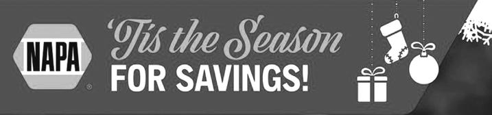 55k 2019 Jeep Grand Cherokee Altitude V6, auto, leather, loaded, silver, 64k 2019 Jeep Grand Cherokee Laredo 4x4 V6, auto, cloth, loaded, gray, 39k 2019 Jeep Grand Cherokee Upland 4x4 V6, auto, cloth, loaded, gray, 32k 2019 RAM 1500 Bighorn Crew 4x4 5.7 Hemi, auto, cloth, loaded, maroon, 25k RAM 1500 BIG HORN CREW CAB, 4X4, 5’7” BOX FINANCE FOR 1.9% APR 1.9 % A PR FOR 60 MONTHS Plus $3,000 Bonus Cash. Only available on select models and trims. Residency restrictions apply. May need to finance through specific institution. Not all customers will qualify. Tax, title and license fees may apply. See dealer for complete details. Must take retail delivery by 11/30/2022. 4x4, crew cab pickup, 7.3 Diesel, 6sp trans, 107,000 m $19,999 2003 Toyota Highlander , V6, loaded, htd leather, 130,000 m $5,999 2004 Ford Ranger ext. cab XLT 4x4 pickup, V6, loaded, 82,000 miles $9,499 2007 Lincoln Mark LT crew cab 4x4 pickup, V8, loaded, htd leather, 135k $12,999 2008 PJ 22’ Bumper Pull, Power Tilt Trailer 14,000 GVWR.................... $4,200 2009 Chevrolet 4500 11’ Walk In Utility Body Truck V8, 60k.......... $19,999 2011 Ford Ranger XLT 4x4, ext cab pickup, V6, loaded, 96,000 miles............ $14,999 2014 GMC Sierra 2500HD 4x4 crew cab pickup, V8, loaded, 148,000 m..... $23,999 6676 Route 415S, Bath, New York • 607.776.2303 Visit our website at: www.affordableautobathny.com for a complete look at our current inventory AFFORDABLE AUTO SERVICE and SALES OPEN MONDAY FRIDAY 8 AM 5 PM • SATURDAY 8 AM 12PM 7443 State Route 415 N, Bath, NY • 607.776.9621 ALL SEASON TIRE SEE US FOR GREAT DEALS! TIRE REBATE OCTOBER 1 - DECEMBER 31, 2021 GET UP TO $200 BACK ON A SET OF 4 SELECT GOODYEAR TIRES WHEN YOU USE THE GOODYEAR CREDIT CARD NOW HIRING MECHANICS HELP WANTED! NOW HIRING MECHANICS CANISTEO AUTO MART, INC. CANISTEO AUTO MART, INC. 47 WEST MAIN STREET CANISTEO, NY 14823 • 607.698.2000 “JUST DOWN THE ROAD FROM HIGH PRICES” www.canisteoa u tomart.net 2020 Chevy Equinox AWD, Blue, PW, PL, PS, Power Liftgate, Heated Seats, 38,700 M...$24,995 2020 GMC Sierra 1500 4x4, Crew Cab, Red, PW, PL, Bed Liner, Running Boards, 25000 Miles...............................................$39,995 2019 Dodge Ram 1500 Classic 4x4, 28,000 Miles, Double Cab, PW, PL, Gray..........$28,995 2019 Jeep Cherokee 4x4, Red, 40,000 Miles, Heated Seats, PW, PL, PS....... $24,495 2019 Jeep Cherokee 4x4, Gray, 53,000 Miles, PW, PL, PS................................ $19,995 2019 Jeep Compass 4x4, Gray, 29,000 Miles, Power Windows, Power Locks...................$24,495 2018 Dodge Grand Caravan 89,000 Miles, Black, V6.................................................. $14,995 2017 Buick Encore FWD, 45,000 Miles, Orange, Power Windows, Power Locks..$15,995 7426 St. Rt. 54N, Bath, NY • (607) 776-3598 For All of Your Automotive Service Needs Email: davescolonialmotors@yahoo.com Hours: Mon.-Fri. 8 am-5 pm $ for a Purchase a Gift Certificate of 50 or More before December 31, 2022 Receive a FREE Gift Certificate 2023 NYS Inspection for your car or pickup truck. Dave’s Colonial Motors Dave’s Christmas Special Dave’s Colonial Motors HURRY!! OFFER ENDS SOON!! EXIT 39, 7255 WORTH RD., BATH, NEW YORK PHONE: 607-776-7777 FOR AN APPOINTMENT BUY 4 NEW TIRES GET HALF OFF AN ALIGNMENT! EXPIRES NOVEMBER 30, 2022 autohavenJoel’s 19 Lackawanna Ave., Bath, NY • 607-664-9017 Joel B. Havens, Owner/Operator All Major Credit Cards Accepted • Light Duty Repair • Alignments • Tires • Batteries • Struts • Brakes • Oil Changes • Winter Tires • Anti-Freeze • Wipers • Much More! don’t let jack frost get TO your car before joel does!!! 4653 St. Rt. 36 • Canisteo, NY 14823 607-698-9900 www.mccourtscollision.com Hours: Monday - Friday, 8:00 - 5:30; Sat. by Appt. Any Insurance Job $1500 or Higher