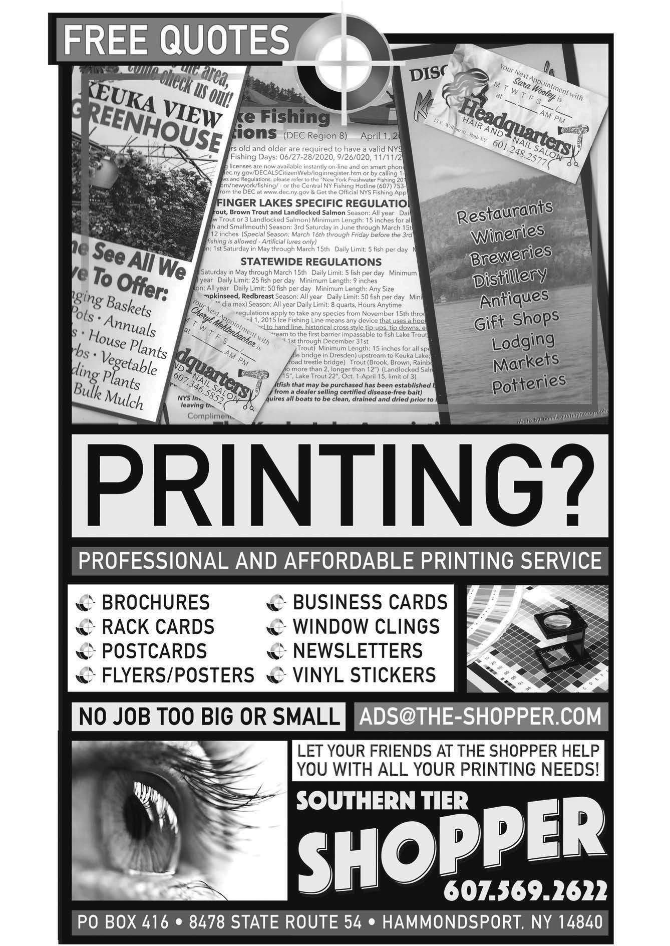 SOUTHERN TIER SHOPPER TUESDAY, DECEMBER 13, 2022 OVER 23,500+ CIRCULATION 9 Y r C plete ELECTRICAL, PLUMBING & HEATING SUPPLY STORE HOURS: MONDAYFRIDAY; 7AM - 5PM SATURDAY; 8 AM - 12 NOON L.M. SUPPLY 1505 INGRAM ROAD, PENN YAN, NY 14527 585.554.4050 WE DELIVER COOKOUT HEADQUARTERS Full Line of Groc ies Deli & Bak y Ice C d Be Full Line of Groc ies Deli & Bak y Stocked with assorted cold cuts, cheeses, salads, cold sandwiches and subs! Try our take-outs... all set to go in individual containers with everything you need, from dressings to forks! Take them to the lake! Great for a ready to go picnic or quick supper, with no work or fuss! Ice C d Be 30 Pack Specials - Over 40 Specialty Beers Soft Drinks • Bagged Ice YOUR COOKOUT HEADQUARTERS for Vacation or Any Time! Hamm dsp t Hamm dsp t GROCERY GROCERY MON - SAT 8:00 AM - 8:00 PM SUN 8:00 AM - 6:00 PM Call In Orders & Curbside Pick-up Available: 607.569.2060 or Hportgrocery@gmail.com 22 Shethar St. Hammondsport SPECI A L S SPECI A L S SPECIA LS Meat M ket Meat M ket INCLUDING ~ Fresh Produce ~ CENTER CUT CHOPS...................... $ 1.99 /LB GROUND CHUCK........................... $ 3.99 /LB BONELESS TOP ROUND LONDON BROIL $ 3.99 /LB WHOLE PORK TENDERLOINS ................ $ 3.49 /LB WHOLE BEEF TENDERLOINS........ $ 11.99/LB CHICKEN DRUMS............................. 99 ¢ /LB BONELSS CHICKEN BREAST .............. $ 1.89/LB 22 Shethar St. Hammondsport $299 $299 BONELESS HALF HAM BONELESS HALF HAM LB BEERS TREE SERVICE, INC. • Residential And Commercial Services • Stump Grinding • Cavity Repair • Lot Clearing • Safety Topping • Trimming • Removal • Cabling GRAPPLE SAW TRUCK • Residential And Commercial Services • Stump Grinding • Cavity Repair • Lot Clearing • Safety Topping • Trimming • Removal • Cabling GRAPPLE SAW TRUCK IT EXTENDS TO 100 FEET, ALLOWING US TO REACH THOSE HARD TO REACH PLACES ALONG WITH KEEPING OUR EMPLOYEES SAFER, ESSENTIALLY ELIMINATING THE NEED TO BE IN THE TREES! 607.569.2852 / 6 07.76 5.915 5 607.569.2852 607.765.9155 P.O. BOX 69 • HAMMONDSPOR T, NEW YORK MARKETING SALES E.O.E. Responsibilities include selling print advertising to established clients as well as soliciting new accounts. This requires you to demonstrate solid presentation skills and the ability to close the sale. Top priority must be given to ensure that your clients experience professional service and enjoy being a customer of our company. Applicants must be personable, neat and have own reliable and insured transportation. Experience preferred but willing to train. Confidential - mail resume or drop off at: PO Box 416, 8478 State Route 54, Hammondsport, NY 14840 or email to: ads@the-shopper.com WANT A CAREER...not just a job? Like working on the road instead of in an office? Like meeting with new people? Want unlimited income potential? 315. 5 3 6. 5 84 8 Garage Doors • Sales And Service Residential And Commercial 2107 SECOND MILO RD • PENN YAN, NY 2107 SECOND MILO RD • PENN YAN, NY • 315. 5 3 6. 5 84 8 PHONE FAX