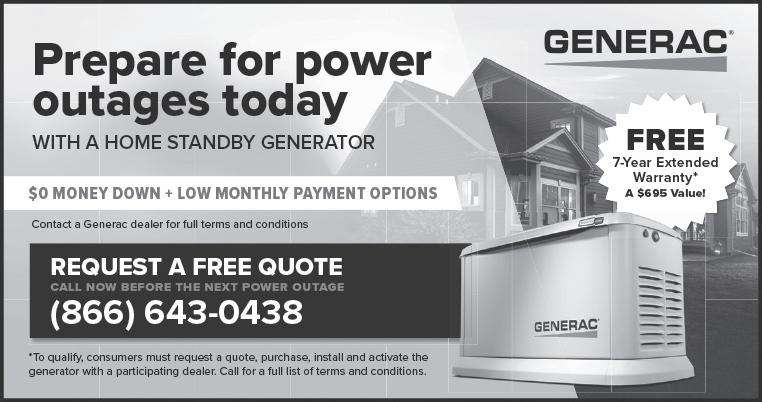 PREPARE FOR POWER OUTAGES TODAY: with a GENERAC home standby generator. $0 down + low monthly pymt. Request a free quote. Call before the next power outage: 1-855948-6176.