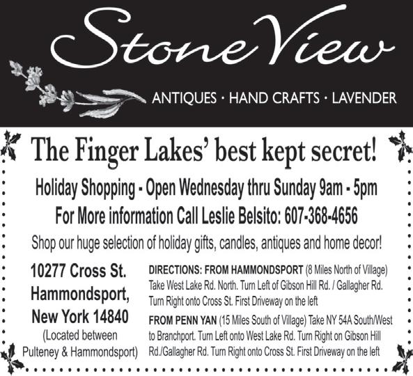 12 SOUTHERN TIER SHOPPER TUESDAY, DECEMBER 06, 2022 OVER 23,500+ Christmas Park Christmas Park IN THE SAT., DEC.10 4:00-8:00 PM 8:00 - 11:00 AM - Breakfast with Santa at the Hammondsport Fire Hall 3:30 PM - Keuka Lake Players Production at the First Presbyterian Church 4:00 - 8:00 PM - Food and Craft Vendors THIS EVENT IS SPONSORED BY: CLEAN & GREEN SOFTWASH ✵ HAMMONDSPORT GROCERY ✵ SHAW INSURANCE AGENCY ✵ THE CINNAMON STICK ✵ BURGERS AND BEER OF HAMMONDSPORT ✵ COMMUNITY BANK ✵ KEUKA LAKESIDE INN ✵ DOYLE VINEYARD MANAGEMENT ✵ BISHOP & DeSANTO FUNERAL HOME ✵ DR. SAM PENNISE ✵ WEIS VINEYARDS ✵ VILLAGE REAL ESTATE TEAM/ MJ PETERSON 4:00 - 7:30 PM - Musical Performances in the Bandstand 6:00 - 8:00 PM - REINDEER 6:00 - 8:00 PM - Horse Draw Wagon Rides 6:00 PM - SANTA CLAUS arrives by fire truck to meet with all the children!! 28 LIBERTY STREET • BATH , NEW YORK • 60 7 .776. 804 0 BUFFET STYLE BREAKFAST: Pancakes • French Toast Scrambled Eggs • Bacon • Ham Sausage • Cracked Potatoes 8:00 AM - 11:00 AM SATURDAY, DECEMBER 17TH 3 12 : $8. 0 0 • 12+ $10 0 0 Chat A Whyle Chat A Whyle Reservations Requested For Parties 5 Or More Autumn Mist Alpacas VISIT WITH SANTA Gift Certificates Available! SHOP IS OPEN AND FULLY STOCKED! Enjoy Some Coffee Or Hot Chocolate With Some Cookies! HOLIDAY OPEN HOUSE FREE ADMISSION! SATURDAY, DECEMBER 10TH 10:00 AM 4:00 PM FREE ADMISSION! VISIT WITH SANTA Gift Certificates Available! 11579 WESSIE ROAD • PRATTSBURGH, NEW YORK 14873 607.868-5401 • WWW.AUTUMNMISTALPACAFARM.COM 72 Cameron Street • Bath, NY • 607-622-5363 www.fingerlakesspca.org E-mail: info@fingerlakesspca.org Finger Lakes SPCA Santa Paws Holiday Event December 10, 2022 10:00AM - 4:00PM 72 Cameron Street, Bath, New York • Cookie Sale (Until GONE) $8 Per Pound, Many Kinds • Pics With SANTA 10 AM 1 PM (For Pets And/Or People) • Caroling In the Courtyard With Common Ground Choir • Adoptions Specials • Refreshments • Holiday Raffle • Gift Shop Specials And Large Holiday Markdowns • Be An “Angel” & Bring Something From Our WISH LIST ( www.fingerlakesspca.org ) For Our Orphan Animals! SCHEDULE OF EVENTS: www.fingerlakesspca.org • E-mail: info@fingerlakesspca.org SERVING STEUBEN COUNTY AND THE FINGER LAKES REGION Open Until Christmas! Garden Center & Nursery 874 ROUTE 14A ( BETWEEN PENN YAN AND HALL ) Shop Wonderful Christmas Gift Items & Holiday Decor! MONDAY SATURDAY 8:00 AM 4:00 PM • CLOSED SUNDAYS www.HorningGreenhouse.com Winter Greens, Wreaths, Poinsettias, Christmas Cactus, Cyclamens & Many Christmas Gift Ideas 31 5.536.3 0 2 8 OR 31 5.5 3 1 88 01 31 5.536.3 0 2 8 OR 31 5.5 3 1 . 88 01 26 MECHANIC STREET • HAMMONDSPORT, NEW YORK 14840 Why go to the mall... We have it all... At the Cinnamon Stick on the Square in Hammondsport. OPEN EVERY DAY 9:00 AM - 5:00 PM Terry Pennise • 607-569-2277 • www.cinnamonstick.com be sure to visit DURING CHRISTMAS IN THE PARK ENJOY A COMPLIMENTARY CUP OF OUR GOURMET COFFEE! NO EXCEPTIONS SATURDAY, DEC. 10 • 9:00 AM - 8:00 PM 20% OFF STOREWIDE 20% OFF STOREWIDE