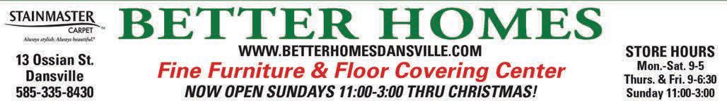 16 SOUTHERN TIER SHOPPER TUESDAY, DECEMBER 06, 2022 OVER 23,500+ CIRCULATION FLORIST 7209 STATE ROUTE 54 • BATH , NEW YORK OPEN Monday Friday 9:00 AM 5:00 PM • Saturday 9:00 AM 12:00 PM BROWSE ON OUR WEBSITE VANSCOTERFLORIST.COM 607.7 76 .218 4 As the holidays approach... Give Gifts with a... Personal Touch! • Fresh Seasonal Flower Arrangements • Fresh Evergreen Wreaths Poinsettias • Flowering Plants • Silk Permanent Designs DELIVERIES IN BATH, SAVONA, BRADFORD, WAYNE, HAMMONDSPORT, AVOCA, CAMPBELL AND PRATTSBURGH 607.776.2184 again. That means it’s time to see how B&D Stoves Old Man Winter is on his way Save Up To 26% O Total Bill On Qualifying Wood And Pellet Appliances. Outdoor Wood Boilers Included!!! Have piece of mind knowing you own a Harman Stove, built to a standard, not a price. Harman Stoves and B&D Stoves, a partnership of quality, service and integrity. Sales, installation & service, with the personal touch! • Pellet • Wood • Coal • Gas Your One Stop Stove Shop can help you stay warm and save money! 7509 County Route 70, Howard, NY Exit 35 off I-86 • 607-566-2124 www.bdstoves.com Pamp Y r Pet 101 Gansevoort St., Bath, NY 607-776-3699 LET US... Grooming for Dogs & Cats to fit ALL your pet’s needs! Graduate of: Rochester Institute of Dog Grooming Member of N.D.G.A.A OPEN: Monday Saturday by appointment for the Holidays Penny’s Pet Parlor GIFT CERTIFICATES AVAILABLE! Pamp Y r Pet Penny’s Pet Parlor Interested In Owning Your Own Propane Tank To Save Money? Swee t water No Start Up Fees • Prices Are Always Current Rate To Join e Co-op, Call 60 7 20 3- 0153 To Purchase A Tank, Call 315 -5 31-8258 Propane C o - op Shovels and Heat Tape Available Be Prepared for WINTER LUMBER Route 54, Bath, NY (607) 776-2051 Shirley’s Prevents Falls & Sliding! Rock Salt & Ice Melt Shovels and Heat Tape Available 5288 McNutt Run Rd., Campbell, NY 14821 607.769.8244 NOW OPEN NOW OPEN F est ’s F est ’s NO CREDIT CARDS CASH OR CHECK ONLY Tree Farm Weekends Until Christmas 10 am - 4 pm WREATHS DISH NETWORK: $59.99 for 190 Chan nels! Blazing Fast Internet, $19.99/mo. (where available.) Switch & get a FREE $100 Visa Gift card. FREE Voice Remote. FREE HD DVR. FREE Streaming on ALL devices. Call today! 1-866-713-1595. BRADFORD SCHOOL DIS TRICT RESIDENTS--DO YOU KNOW ANYONE IN NEED OF FOOD?: The Bradford Food Pan try is open on the third Wednesday of each month from 9am to 11am at St Stans Church. (12/20) ELIMINATE GUT TER CLEANING FOREVER! LeafFilter, the most ad vanced debris- block ing gutter protection. Schedule free Leaf Filter estimate today. 20% off Entire Pur chase. 10% Senior & Military Discounts. Call 1-833-610-1936.