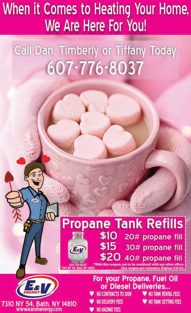 SOUTHERN TIER SHOPPER TUESDAY, FEBRUARY 07, 2023 OVER 23,500+ CIRCULATION 3 compassionatecleanoutservices.com 60 7.6 61.6731 Estate Liquidation & Cleaning Services COMPASSIONATE CLEANOUT SERVICES REFUNDTAXSPECIAL MonthofFebruary 60DayLAYAWAY oronanyHandgun onlyLongGunfor Paymenta$50Down GUN SHOP Louie’s 607.776.4228 367 WEST MORRIS STREET (I-86, EXIT 38) BATH, NEW YORK 14810 MON. - FRI. 9:00AM - 5:00PM • SAT. 10:00AM - 1:00PM Buying • Selling • Trading GU NS! Buying • Selling • Trading GUNS! Valentine’s Gift Certificates Available Proposals Are Available By Calling 607-776-3301 Ext. 1103 Is Accepting Bids For Concrete Work Until February 28th BATH CENTRAL SCHOOL DISTRICT Is Accepting Bids For Concrete Until February TREE SERVICE, INC. BEERS EXPERIENCE NOT NECESSARY BEERS SERVICE, INC. WILL TRAIN! 6 0 7.56 9. 2 34 0 6 0 7.56 9. 2 34 0 TRY METAL ROOFING CONTACT ME FOR A FREE ESTIMATE! Mail me a note with your contact info & phone number BEN TROYER 8020 SHAUT ROAD • AVOCA, NEW YORK 14809 An Affordable Roof With A 40 Year Paint Warranty 18 DIFFERENT COLORS AVAIALBLE Is Your Roof Leaking?? Does Your House Need A Facelift? BOOK NOW FOR SPRING INSTALLATION! EXPERIENCE NOT NECESSARY 6 0 7.56 9. 2 34 0 6 0 7.56 9. 2 34 0 WILL TRAIN! VELEY E NTERPRISES DOCK, BOATHOUSE AND SEAWALL CONSTRUCTION E NTERPRISES DOCK, BOATHOUSE AND SEAWALL CONSTRUCTION Tree Trimming • Tree Removal Stump Grinding Free Estimates / Fully Insured Boone (315) 694-1661 Brad (607) 661-2218 SEA N STOPKA SEA N STOPKA A A TREE SERVICE 607.664 .7589 TREE TRIMMING AND REMOVAL DEBRIS & COMPOST PILE REMOVAL STUMP REMOVAL AND GRINDING FREE ESTIMATES • FULLY INSURED LOCALLY OWNED & OPERATED 6683 ROUTE 415 SOUTH • BATH • NEW YORK 6683 ROUTE 415 SOUTH • BATH • NEW YORK FRESH SUBMARINES!!! MAKE ANY INTO A WRAP OR SALAD FRESH SUBMARINES!!! MAKE ANY INTO A WRAP SALAD CHECK FACEBOOK DAILY FOR OUR SUB SPECIALS!! SUBS • WRAPS • SOUPS CUSTOMIZE YOUR OWN SUB OR WRAP PLATTER!! $2.50 PER PERSON, PLUS TAX. Check Out Our Veggie, Sandwich Or Wrap, and Appetizer Platters For Your Next Sports Gathering Or Event! 607-776-2233 PH : HOURS: MON. - FRI. 9:00 AM - 5:00 PM • SAT 8:00 AM - 2:00 PM • SUN. CLOSED DELI MEATS • WHOLESALE GROCERY EVERYTHING FOR THE BIG GAME! Chicken Wings, Frozen Soups, Mozzarella Sticks, French Fries, Onion Rings, Frozen Pasta And Our Selection Of Frozen Fruit and Veggies! PLUMBING & ELECTRICAL SUPPLIES MAJOR APPLIANCES 315-536-7033 24 Main St., Penn Yan, NY • www.pinckneys.com Height: 47 Inches, Depth: 29 Inches Width: 59 Inches, 39000