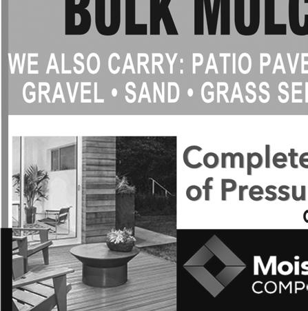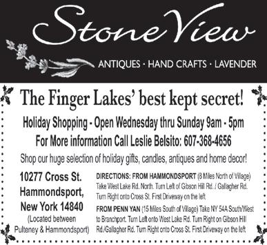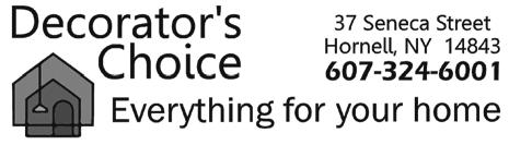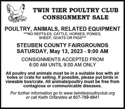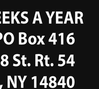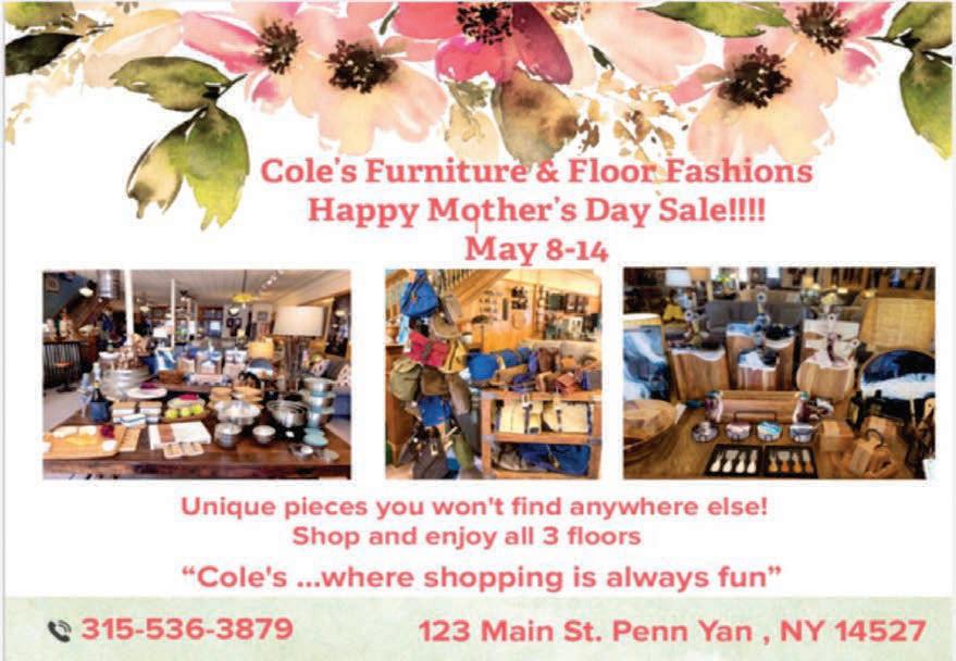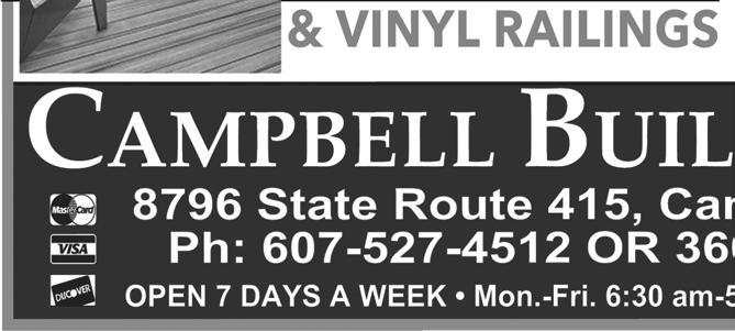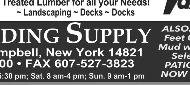 SOUTHERN TIER SHOPPER TUESDAY, MAY 09, 2023 OVER 23,500+ CIRCULATION 23 13920 State Route 54 • Hammondsport, New York 14840 Reservations: 607.292.3920 Wine & Food ExperiencePairing May 12th - 14th WEEKEND 10:00AM to 6:00PM DOMAINE LESEURRE WINERY LIMITED SEATING AVAILABLE $40.00/PERSON (607)527-8872 sales@jimsequipment.com Instant Rebates on in stock 2022 Models: - 2wd EV $1400 off!! - L7 4x4 $750 off!! 35 MU LCH CHRISTY PAVING 6 0 7. 20 7. 7176 23 RACE STREET COOPERS PLAINS • NEW YORK Brown, Black, or Red per yard Natural Discount for Bulk Orders over 25 yards Garden Compost, Wood Chips, Stone, Topsoil, Driveway Sealer And Supplies Also Available MU LCH MU LCH $35 Natural $$35 $25 25 Discount for Bulk Orders over 25 yards Garden Compost, Wood Chips, Stone, Topsoil, Driveway Sealer And Supplies Also Available Playground Main Street Almond, New York Mon, Tues, Wed & Fri, 9AM - 5PM Thurs, 9AM - 6PM • Sat, 9AM - 3PM Carpet • Hardwood • Vinyls • Laminate 6 0 7.2 76.52 0 0 “DON’T BUY CHEAP FLOORING CHEAP, BUY QUALITY FLOORING CHEAPER!” FREE ESTIMATES!! Largest Selection Of In Stock And Special Order Lock - Together & Glue-Down Waterproof Vinyl Planks and Tiles In The Southern Tier!! NO TRICKS, NO GIMMICKS... JUST GREAT DEALS!! CARPETOVER500 REMNANTS&VINYL INSTOCK! CHOOSE FROM OVER 400,000 sqft IN STOCK! CHECK OUT NRFSELECT.COM FOR A HUGE SELECTION OF PRODUCTS! ANNUAL GARAGE SALE BIG BARN BONANZA! PROCEEDS BENEFIT KEUKA COMFORT CARE HOME, PROVIDING COMFORT CARE FOR FOR THE TERMINALLY ILL TUESDAY, MAY 30: 10-2, AT THE FAIRGROUNDS CALL 315.536.1690 WITH QUESTIONS ANNUAL GARAGE SALE TAKE-IN DATES - MONDAY, MAY 29: 10-2 FRI, JUNE 2 • 9-4 SUN, JUNE 4 • 9-2 YATES CO. FAIRGROUNDS ANTIQUES • FURNITURE HOUSEHOLD ITEMS • MORE STOCK UP NOW AND SAVE! 11451 TOBEYTOWN ROAD, PINE CITY, NY FREE PORK BBQ & SOFT ICE CREAM MARK YOUR CALENDAR - JUNE 1, 2, & 3 OPEN HOUSE! MAY SPECIAL!!! RED HOT SALE John F. Martin All Natural Smoked Bacon 5 lb. Packs $4.59/LB Bacon Ends $3.59/LB www.catonbutchershop.com 5 lbs Sirloin Steak • 5 lbs Beef Cube Steak • 5 lbs Beef Roasts • 10 lbs Ground Beef • 5 lbs Pork Steak • 5 lbs Hot or Sweet Sausage • 5 lbs Chicken Breasts 10% OFF STOREWIDE $150 BUNDLE SPECIAL MOM’S WEEKEND SALE!