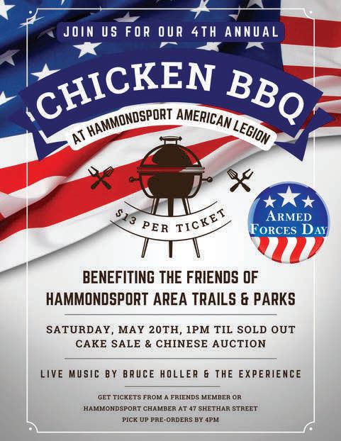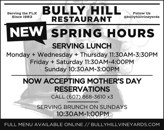 SOUTHERN TIER SHOPPER TUESDAY, MAY 09, 2023 OVER 23,500+ CIRCULATION 21 goo d t im es METHODIST CHURCH M ITCHELLSVILLE On 4/22/23, we sponsored our well known Chicken & Biscuit Dinner; our first in three years. We thank the community for your support. Dinners sold out in less than an hour and we had to turn away many people. Please accept our apology. We promise to make changes with future dinners. Thank you again for your support. 8421 Co. RT.13 Bath • NY 14810 This is a message from the Mitchellsville Methodist Church. Thank Y f y r supp t! Moth ’s Day Breakfast Buffet Moth ’s Day Breakfast Buffet OPEN TO THE PUBLIC SUN, MAY 14 • 8:00 - 11:00 AM Bath VFW Post 1470 7230 St. Rt. 54, Bath, NY ALL MOTHERS ARE FREE! 2 & Under, FREE • Children 3 - 5, $7 • All Others, $13 J n us f Fath ’s Day Also - June 18! No Take-Outs CAMPBELL TOWN WIDE RUMMAGE SALES CRAFT FAIR AT THE NEW CAMPBELL FIRE STATION CHICKEN BBQ AT FIRE DEPARTMENT MAY 20TH • STARTING AT 8:00 AM 8766 STATE ROUTE 415 10:00 AM UNTIL GONE Howard Community Center “The Vintage Market” Country Line Dance Take I-86 to Exit 35, turn left from Bath, through 4 corners, 1/8 mile on the right. MAY 13, 2023 7PM - 11PM 8 $ 8280 St Rt 54 Hammondsport, NY 607- 56 9-2844 Breakfast Sandwiches • 7” Breakfast Pizzas • Breakfast Tornados BREAKFAST AVAILABLE DAILY SUN.- THURS. 4:30 AM - 9:00 PM ; FRI. -SAT. 4:30 A M - 10:00 PM LAKES GAS NY LOTTO SCRATCH OFF GAMES - STOP IN & PLAY! WEDNESDAY Chicken Cordon Bleu Bites $2 59 PLUS TAX FRESH MADE HOT & COLD SUBS HALF $6.99 + TAX WHOLE $11.99 + TAX PIZZA SPECIALS SHEET CHEESE PIZZA $22.69 + TAX Additional Toppings $3 each $7.39 DZ + TAX BONELESS CHICKEN WINGS LARGE CHEESE PIZZA $13.69 + TAX Additional Toppings $2 each MONDAY Chicken Breast Sandwich $4 99 PLUS TAX TUESDAY Buffalo Chicken Logs $1 49 PLUS TAX THURSDAY Burgers $4 59 PLUS TAX Friday Half Philly Cheesesteak Sub $7 99 PLUS TAX * Roast Beef Extra Charge LIVE BAIT! Happy Mother’s Day! Route 333, Campbell, New York • 6 07.527.8058 OR STOP IN FOR A TEXAS HOT OR FOOTLONG SERVING BREAKFAST ALL DAY OPEN: MONDAY THROUGH SATURDAY 6:00 AM - 2:00 PM 07.5 2 Stop In And Try Stop In And Try One Of Our One Of Our Delicious Burgers! Restaurant & Bar Open Seven Days A Week For Lunch And Dinner OPEN AT 12:00PM Join us for Mother’s Day • Dinner Menu All Day! www.theswitz.com Keuka’s Original Family Restaurant Established 1894 607-292-6927 14109 Keuka Village Road, Keuka Village, New York us for Mother’s • Dinner All Day!