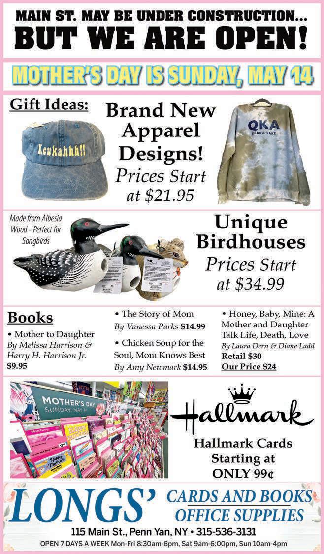 24 SOUTHERN TIER SHOPPER TUESDAY, MAY 09, 2023 OVER 23,500+ CIRCULATION Specialty Food. Friendly Service. BULK FOODS AK H ILL Pulled Pork Panini $8.49 $3.75/sm $4.49/lg Honey Lavender Iced La�e Oak Leaf Cafe & Bakery Sales valid May 1st - 13th, 2023 3173 NY-14A, Penn Yan, NY 14527 315-536-0836 Hours: Monday - Saturday 8am - 6pm Cafe Hours: 7am-4pm TREES • SHRUBS • PERENNIALS 874 Route 14A (Between Penn Yan & Hall) Garden Center & Nursery See Store For Details Great Selection of House Plants and Mini Plants! Dollars Now!! MAJOR CREDIT CARDS ACCEPTED MONDAY - FRIDAY 7:00 AM - 7:00 PM • SATURDAY 7:00 AM - 5:00 PM • CLOSED SUNDAY MONDAY - FRIDAY 7:00 AM - 7:00 PM • SATURDAY 7:00 AM - 5:00 PM • CLOSED SUNDAY 315-536-3028 or 315-531-8801 • www.HorningGreenhouse.com Wonderful Selection of Hanging Baskets, Filled Planters, Lawn Furniture, House Plants And Many More Gift Ideas For Mom! Azaleas • Rhododendrons • Strawberry Plants • Bulbs Asparagus Roots • Garlic • Knockout Roses • Planters Vegetable Plants • Geraniums • Bedding Plants Sweet Potato Plants • Hanging Baskets • Garden Seeds Flowering Plants • Seed Potatoes • Onion Sets Bulk and Bag Mulch • Mushroom Soil • Bag Soil Large Selection of Gardening Supplies • Quality Lawn Furniture Made Locally By Our Family EXTENDED HOURS: Mon.-Fri 7AM-7PM Saturday 7AM-5PM Happy Mothe r’s Day!