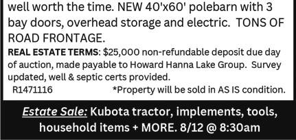 MUD CREEK KENNELS - BOARDING: Your pet’s home away from home. Phone: 607-583-2055. (eow) FOR SALE: Cava-Poo Puppes, upd to date on shots, wormed, friendly, playful & ready to be called yours! Call to- day, $495 each - 315- 536-7978. (8/1) The Pick-Your-Own Blueberry Season is Here!!! r Blueber y Hill Far m OPENING JU LY 26 th rBluebery Hill Farm HORNELL, N.Y. - “New York’s Premier Berry Farm” HOURS: Mon.-Fri. 7 AM - 7 PM Saturday 7 AM - 5 PM We suggest calling ahead for picking dates. Picking buckets and stools, eld transportation, a picnic area and modern restrooms are all provided. Follow direction signs from Route 36, just North of Exit 34N Southern Tier Expressway (Route 17), or from Route 21 at Almond Dam. 6 0 7.3 2 4. 5 3 21 High Quality Memorials at Lower Prices Hills Monument Studio Artistry in Stone 372 Park Avenue, Corning, NY 14830 607.936.4677 or 888.628.4679 hillsmonuments.com hillsmonuments@gmail.com Bryan Hills Designs for Life... Endless varieties to choose from! GET YOUR FREE ESTIMATES NOW PROFESSIONAL AND FULLY INSURED All Types of Excavation • Site Development and Grading Pond Building • Septic System Investigation and Installation Drain Tile and Waterlines • Stone Driveway Construction All Types of Concrete Work • Porches and Decks Stone, Gravel and Topsoil Deliveries • Trucking • Additions 607.527.325 6 OR 607.36 8. 809 8 VISIT OUR WEBSITE AT WWW.ELLIOTTCS.COM E LLIOTT Construction Services, LLC E LLIOTT 5054 COUNTY ROUTE 125 CAMPBELL , NEW YORK 14821 THE TOWN OF HOWA R D HOWARD HAS A NEW E BSI T E HAS A NEW WEBSITE CHECK US OUT ON THE WEB AT: how a r d ny.co m howardny.co CHECK US OUT ON THE WEB AT: Call Today For A FREE Estimate! POLE BARNS & ROOFING ROOFING Countryside grocery Home: 315.531.9852 | Store: 315.694.7575 A country store with a family atmosphere. Specializing in discount groceries! Mon - Fri 8AM - 5PM | Sat 9AM - 3PM 2500 Hazard Road Penn Yan, NY 14527 John & Martha Noit 315. 5 3 6. 5 84 8 Garage Doors • Sales And Service Residential And Commercial 2107 SECOND MILO RD • PENN YAN, NY 2107 SECOND MILO RD • PENN YAN, NY 315. 5 3 6. 5 84 8 PHONE FAX Tree Trimming • Tree Removal Stump Grinding Free Estimates / Fully Insured Boone (315) 694-1661 Brad (607) 661-2218 Precision Painting Services “Professionalism at its Best” Interior - Exterior Custom Painting Staining Home Repair Serving the Southern Tier CALL TODAY: 607.684.5368 FREE ESTIMATES • FULLY INSURED DANSVILLE WATER WELLS DANSVILLE WATER WELLS WATER WELLS SINCE 1977 Complete Systems from Well to House SOLD & SERVICED CERTIFIED Ron Hall 585.335.3356 HOURS: MONDAY AND WEDNESDAY 10:00 AM - 6:00 PM TUESDAY 9:00 AM - 4:30 PM • THURSDAY 9:00 AM - 12:00 PM FRIDAY 9:00 AM - 4:30 PM • CLOSED SATURDAY AND SUNDAY CA N & BOT TLE RETURN Front Door Drop Off No Quantity Limits 7984 Hemlock Rd, Bath , NY Now Accepting NYS 5¢ Water Bottles C ON R A D’S 6 0 7.7 76 .74 3 5 6 07.7 76 .7435 We do a select cut of damaged, diseased, and mature trees to make room for smaller ones to grow. We also now offer residential tree removal. WE ARE FULLY INSURED AND OFFER FREE QUOTES! EGGLESTON LOGGING & TREE SERVICE FAMILY OWNED & OPERATED SMALL BUSINESS 6 . .1 6 0 7.7 7 6 .17 74 607.776.1774 We l k f w d to he ing y ! We d he 6257 RIDGE ROAD • AVOCA , NY 14809 ( DROP ME A NOTE AND I WILL CALL YOU BACK ) CONSTRUCTION BROTHERS CONTACT US TODAY FOR A COMPETITIVE FREE ESTIMATE ON YOUR PROJECT! WE SPECIALIZE IN POLE BARNS, GARAGES, ROOFING, AND DECKS 1536 FRIEND ROAD • PENN YAN , NY Italy Valley Nursery 58 5. 554. 532 5 HOURS: BY CHANCE OR BY APPOINTMENT Ornamental Trees and Shrubs Parts & Service for All Major Brands Get A FREE Quote On A Brand New Zero Turn Mower Titus M. Hoover • 3752 Prosser Rd., Branchport, NY Authorized Dealer for 315-595-2894 315-595-2894 WE ARE THE PREMIER BARGAIN STORE OF THE FINGER LAKES! 848 ROUTE 14A, PENN YAN, NY • 315.536.2253 ( 1ST PLACE N. OF HORNINGʼS GREENHOUSE ON LEFT) KITCHENWARE • HOME DECOR • TOYS • EXERCISE EQUIPMENT BEDDING • CURTAINS • BABY ITEMS • SMALL APPLIANCES HOME MADE COOKIES & BREAD • MUCH, MUCH MORE!!! HOURS: MONDAY - SATURDAY 9AM - 5PM • CLOSED SUNDAY OPEN FRIDAY NIGHTS UNTIL 8:00 PM We Donʼt Have Everything, But We Sure Have A Lot!