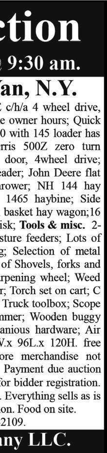 18 SOUTHERN TIER SHOPPER TUESDAY, JULY 25, 2023 OVER 23,500+ CIRCULATION THUNDERSTORMS MOSTLY SUNNY PARTLY CLOUDY 82°/60° THUNDERSTORMS THUNDERSTORMS TUESDAY WEDNESDAY 87°/65° THURSDAY FRIDAY SATURDAY SUNDAY 80°/63° 91°/68° THUNDERSTORMS 89°/68° 86°/64° www.jimsequipment.com sales@jimsequipment.com 607.527.8872 800.450.8872 8597 Main Street Campbell, NY 14821 SNOW SHOWERS $7,9996676 Route 415S, Bath, New York • 607.776.2303 Visit our website at: www.affordableautobathny.com for a complete look at our current inventory AFFORDABLE AUTO SERVICE and SALES 2009 Ford F750 New 11’ Mason Dump, 6.7 Liter Cummins, 26,000 miles $44,999 2014 International Terrastar 4x4 Switch & Go, 6.4 diesel, 40,000 miles $47,999 2005 Chevrolet 4500 Bucket Truck Onan generator, V8, 132,000 miles $24,999 2011 GMC Sierra 1500 Reg. Cab shortbed pickup, V8, loaded, 116,000 mi $11,999 2015 Ram 3500 Tradesman 4x4 crew cab pickup, V8, loaded, 72,000 mi $28,999 2014 Ford F150 STX Extended cab 4x4 pickup V8, loaded, 92,000 miles $17,999 2011 Chevrolet Equinox 4 Dr. SUV, 4 cyl, AWD, loaded, 130,000 miles $7,999 2011 Toyota Rav 4 4x4 4dr SUV, 4 cyl, automatic, loaded, 130,000 miles $10,999 Open Monday-Friday 8 AM - 5 PM • Saturday 8 AM - Noon 7443 State Route 415 N., Bath, NY • 607-776-9621 ALL SEASON TIRE • Alignments • Brakes • NYS Inspections • 24 Hour Rollback Service Call: 769-4426 ALL SEASON TIRE SEE US FOR GREAT DEALS! autom otiv e 110 MACE STREET PENN YAN, NEW YORK RESERVATIONS: 315.536.8202 New Menu Each Month Seating Starting At 11:00 BRUNCH JOIN US THE LAST SUNDAY OF THE MONTH FOR OUR JOI N U S THE L AST THE M ONTH F O R OUR banquet & conference center O N T H O U R $ 25.95 ADULTS • $ 20.95 SENIORS • $ 15.95 AGES 4-12 • 3 & UNDER FREE! Sunday 11 AM - 2 P M TUESDAY - FRIDAY 11:00 AM - CLOSE SATURDAY NOON - CLOSE LIBER T Y S TREE T PUB LIBERT STREET 6 07.776.3 60 0 607.776.3 Friday: Fish Fry Night Saturday: Prime Rib Friday: Fish Fry Night Saturday: Prime Rib 7 LIBERTY STREET BATH , NEW YORK HELP WANTED: COOKS Pick Your Own Blueberries (Mon-Sat) Pick Your Own Red Raspberries (M-W-F) Pick Your Own Black Raspberries NOW OPEN!!! SUGAR SHACK PICKING HOURS FOR JULY & AUGUST 2023 MONDAY-SATURDAY 8AM-4PM • CLOSED SUNDAY DAILY RECORDED MESSAGE ON PICKING CONDITIONS BRING BRINGABOX ABOX ABRING PAIL PAIL OPEN JULY THROUGH LABOR DAY 824 E. Swamp Road • Penn Yan, NY PHONE: 585-526-5442 FREE TO THE PUBLIC PULTENEY PARK • BATH, NEW YORK MUSIC PARK IN THE MUSIC PARK IN THE 5:30 PM - 7:30 PM WEDNESDAY, AUGUST 2ND Ampersand WED., AUG 9TH EVAN DILLON BAND 50/50 Raffle • Bring Your Lawn Chair Music In The Park Is Brought To You By The Following Sponsors: 607.6 54 .1916 HOURS: Monday - Thursday 6:00 AM - 11:00 PM; Friday & Saturday 6:00 AM - 1:00 AM; Sunday 8:00 AM - 8:00 PM Credit & Debit Cards