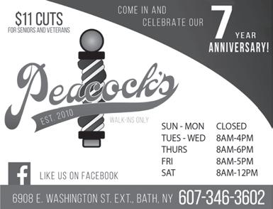 nails. She is available Monday & Tuesday, or by appointment. 607.382.3834. Marissa is a nail tech that specializes in nail art, by appointment. 607.377.9013 6910 East William St. Ext., Bath, NY 14810 • Hair Cut.................................$18 • Spot Perm.............................. $45 • Full Perm................................$55 • Highlite...................................$45 • Foils.........................................$55 • Shampoo/Set.........................$18 Sue Leasure, Unisex Hairstyling For All Ages NEW CUSTOMERS WELCOME! FLEXIBLE HOURS Sue’s Beauty (35 years at this location) 607-776-6829 Allison Merry Offierng full retail: Aquage, Paul Mitchell 7172 Route 54 (Sears Plaza) Bath, NY 607-776-3753 Call Tammy & Maureen for an Appointment For All Hair Care Needs Totally New Look? * We offer a wide variety of coloring techniques Looking for a 6948 Rumsey Street Ext., Bath, NY 14810 607.329.2578 YOU DREAM IT, WE BUILD IT ! www.mjcontractingwesternny.com Free Estimates • Fully Insured • References SPECIALS ON WINDOWS, VINYL SIDING AND POLE BARNS! MJ CON T RACT ING DECKS • ADDITIONS NEW REPLACEMENT WINDOWS