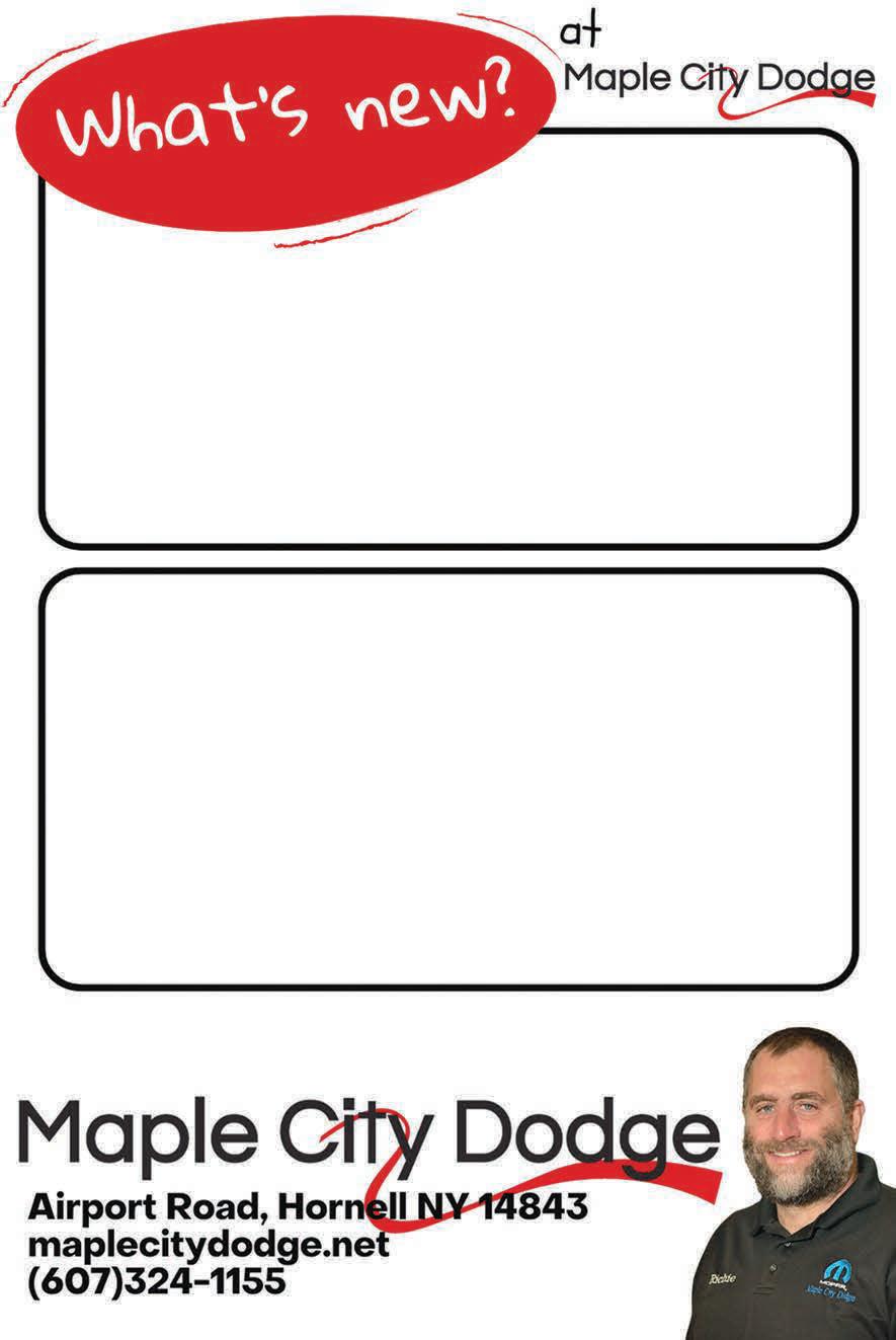 SOUTHERN TIER SHOPPER TUESDAY, SEPTEMBER 26, 2023 OVER 23,500+ CIRCULATION 19 autom otiv e $7,9996676 Route 415S, Bath, New York • 607.776.2303 Visit our website at: www.affordableautobathny.com for a complete look at our current inventory AFFORDABLE AUTO SERVICE and SALES 2011 Ford Focus SE 4drsd, 4cyl, automatic, loaded, 52k $6,499 2015 Ford Focus SE 4dr hatchback, 4cyl, automatic, loaded, 91k $8,999 2016 Chevrolet Cruze LT 4drsd, 4cyl, loaded, 124k $7,999 2008 Toyota Highlander Limited 4x4 4dr SUV, leather, 3rd Row, 116k $11,999 2010 Jeep Wrangler Unlimited 4x4 4dr SUV, V6, loaded, hard top,101k . $15,999 2014 Dodge Grand Caravan SE 4dr, V6, rear heat and A/C, 71k $12,499 2005 Chevrolet 4500 Bucket Truck Onan Generator, V8, 132,000 mi $19,999 2009 Chevrolet 3500HD Reg. Cab, 4x4, 9’ utility body, V8, 56,000 miles $19,999 Open Monday-Friday 8 AM - 5 PM • Saturday 8 AM - Noon 7443 State Route 415 N., Bath, NY • 607-776-9621 ALL SEASON TIRE • Alignments • Brakes • NYS Inspections • 24 Hour Rollback Service Call: 769-4426 ALL SEASON TIRE SEE US FOR GREAT DEALS! CANISTEO AUTO MART, INC. CANISTEO AUTO MART, INC. 47 WEST MAIN STREET CANISTEO, NY 14823 • 607.698.2000 2021 Buick Encore GX AWD, 27,600 miles, nicely loaded $23,995 2020 Buick Envision Essence AWD, 18,700 miles, with leather and loaded $30,995 2020 Buick Encore AWD 40,800 miles............ $20,995 2020 Buick Encore AWD, 24,006 miles, $22,995 2019 Chevy Equinox AWD, 49,610 miles, $21,995 2017 Chevy Equinox AWD, 60,000 miles, $16,995 SALES AND SERVICE www.canisteoa u tomart.net AUTO SALES AND SERVICE FOR 50 YEARS “Just Down The Road from High Prices” For All of Your Automotive Service Needs Email: Davescolonialmotors@yahoo.com Hours: Monday - Friday 8 AM - 5 PM Dave’s Colonial Motors 7426 State Route 54N • Bath, NY 607.776 .3598 FOR ALL YOUR AUTOMOTIVE NEEDS! BACK TO SCHOOL!! MAKE SURE YOUR VEHICLE IS READY FOR autohaven haven Joel’s • Light Duty Repair • Tune-Ups • Tires • Batteries • Struts • Brakes • Alignments & Custom Exhaust “The Place Your Car Can Depend On!” 19 Lackawanna Ave., Bath, NY • 607-664-9017 Joel B. Havens, Owner/Operator All Major Credit Cards Accepted MANY USED VEHICLES ON THE LOT! Visit maplecitydodge.net to see our inventory! Richie Burch, General Manager You must live in the Northeast Business Center to qualify. If you are local, you likely do, but check with us. 2023 JEEP GLADIATORS 10% OFF MSRP! HURRY! YOU MUST TAKE DELIVERY BY OCTOBER 2, 2023 HERE NOW! HERE NOW! HERE NOW! 2023 JEEP GLADIATORS 10% OFF MSRP! Since 1959 1698 ROUTE 14A • PENN YAN 31 5 . 53 6. 448 8 Ma rbl e ’ s Ma s AUTOMOTIVE SALES • REPAIR • COLLISION marblesautomotive.com NEW ARRIVALS NEW ARRIVALS 2019 Chevy Trax LT AWD, 1.4 liter, four cylinder, alloy wheels, and a power seat. Only 19,294 miles! $21,995 2022 Chevy Silverado 1500 Regular cab, eight foot box, 5.3L V8, power windows and locks, cruise control, and white exterior. Only 20,189 miles! $29,995 4653 St. Rt. 36 • Canisteo, NY 14823 607-698-9900 www.mccourtscollision.com Hours: Monday - Friday, 8:00 - 5:30; Sat. by Appt. Any Insurance Job $1500 or Higher MOBILE SERVICE WE BRING THE SHOP TO YOU! • SERVING STEUBEN COUNTY • PRIVATE AND COMMERCIAL • CARS, TRUCKS, RVS AND BOATS Eric Lesjack Email: lesjack.e@yahoo.com Complete Interior & Exterior.....$175.00 Interior or Exterior....................$100.00 CLEAN & SHINE! 58 5. 35 6.0 62 8 5 8 3 5 6 .0 FULLY INSURED E-MAIL ADS TO: ads@the-shopper.com IN CASE OF EMERGENCY DIAL 9-1-1