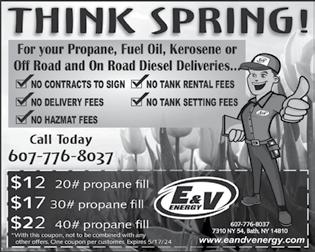 SOUTHERN TIER SHOPPER TUESDAY, APRIL 16, 2024 OVER 25,000+ CIRCULATION 13 RICE AND NUT $ 47500 LOW PRICES! QUALITY PRODUCTS EXCEPTIONAL SERVICE 7147 STATE ROUTE 415N BATH , NEW YORK 14810 MON - FRI: 9 AM - 5:30 PM SATURDAY 8 AM - 12 NOON 6 07.7 76 .670 3 HOMESTEAD COAL INC. RICE, BUCKWHEAT, PEA, CHESTNUT AND STOVE COAL FEED FOR HORSE, BEEF, PIG AND CHICKEN PINE CREEK NON-GMO FEED DEALER www.homesteadcoal.com 20 LB PROPANE REFILL COAL $399/TON FIREWOOD MIXED HARDWOOD •DELIVERY AVAILABLE FACE CORD PICKED UP $8000 $8000 FACE CORD PICKED UP WOOD PELLETS PELLETS $ 800 $ 35500 PER BAG TON $1475 $ 499 $3700 $3900 PER YARD BLACK/RED PER YARD BROWN PER BAG BAGGED MULCH BAGGED COAL PER TON 475 MULCH !! !! open for the season PHONE: 607.292.6188 9915 Keuka Hill Road , Dundee , New York MONDAY THROUGH SATURDAY 8:00 AM - 7:00 PM • CLOSED SUNDAY Hanging Baskets • Patio Pots • Annuals Perennials • Vegetables • Seeds Bedding Plants • Bagged & Bulk Mulch Lawn Decor • Delivery Available For Mulch open for the season SELECT FROM THE BEST... CLOSED MAY 9TH FOR ASCENSION DAY PLUMBING & ELECTRICAL SUPPLIES MAJOR APPLIANCES 315-536-7033 24 Main St., Penn Yan, NY • www.pinckneys.com EXPIRES JUNE 30, 2024 COUPON WHEN YOU SPEND $ 2 5.00 ON REGULAR PRICED MERCHANDISE ONLY. $5 OF F PINCKNEY HARDWARE � PINCKNEY HARDWARE � PINCKNEY HARDWARE � PINCKNEY $ PINCKNEY HARDWARE � PINCKNEY HARDWARE � PINCKNEY HARDWARE � PINCKNEY OF F FOR ALL YOUR PUMPING NEEDS SERVING STEUBEN COUNTY RESIDENTIAL and COMMERCIAL EMERGENCY SERVICE AVAILABLE YEAR 'ROUND INSTALLATION OF COMPLETE SEPTIC SYSTEMS PHONE: 607-776-1700 OR 1-800-279-0044 P.O. BOX 707, Bath, New York 14810 After Hours Emergency: 607-776-6131 SE A N STOPK A SE A STOPK A TREE SERVICE 607.664 .7589 TREE TRIMMING AND REMOVAL DEBRIS & COMPOST PILE REMOVAL STUMP REMOVAL AND GRINDING FREE ESTIMATES • FULLY INSURED LOCALLY OWNED & OPERATED HAMMONDSPORT BARBERSHOP 56 Main St. 315.523.0693 NEW SPRING HOURS: Closed Sunday And Monday Tuesday....................................9:00AM - 5:00PM Wednesday..............................9:00AM - 5:00PM Thursday.................................10:00AM - 7:00PM Friday.......................................9:00AM - 5:00PM Saturday.................................7:00AM - 12:00PM HAIRCUT PRICES ARE $ 15.00 AS OF APRIL 16TH 315-536-3038 315-536-3038 JIM COVELL & SON JIM COVELL & SON TREE TRIMMING & REMOVAL TREE TRIMMING & REMOVAL CALL ANYTIME FREE ESTIMATES • FULLY INSURED 60 YEARS EXPERIENCE STUMP GRINDING • 24 HOUR EMERGENCY SERVICE NEWSPRINT AVAILABLE for gardens and/or bedding TUESDAY THROUGH THURSDAY call ahead 607.569.2622 “When s e e y l e bec es a mem y, that mem y bec es a eas e.”