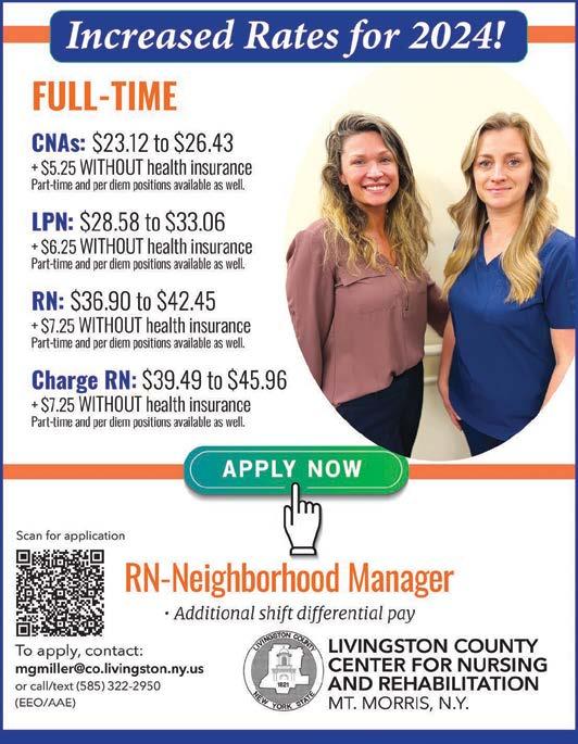 Attendance at all monthly Town Board meetings. Please return by mail your letter of interest and resume to Wendy Oman, Secretary to the Supervisor, or drop off to Wendy at the Campbell Town Hall by 2:00PM April 22, 2024. This institution is an equal opportunity provider, and employer. No discrimination shall be tolerated due to age, race, creed, color, national origin, sexual orientation, military status, sex, disability, marital status, domestic violence victim status, gender, identity and criminal history. NOW HIRING 6 07.56 9.2770 Or info@boathousekeuka.com GAS DOCK ATTENDANT SEASONAL - PART TIME POSITION FOR RENT IN BATH: 900 sq ft of- fice/store front located at 11 Wilkes Ave, adjacent to Bath Municipal parking lot. Phone 607-329-2896. r FOR RENT: Office/ Store Front, 3410 Rte 414, Corning, NY. 840 sq. ft. open space with plumbing avail- able for hair salon, can be used for multiple purposes, good road exposure with parking, newer con- struction.... $695.00 per month plus utili- ties with 1 year lease. Additional discount with longer term lease. Call 607-7697777. r FOR RENT: Beautiful country style 2 bedroom home. Ground level. Must see! Phone 607-2801234. (4/23)